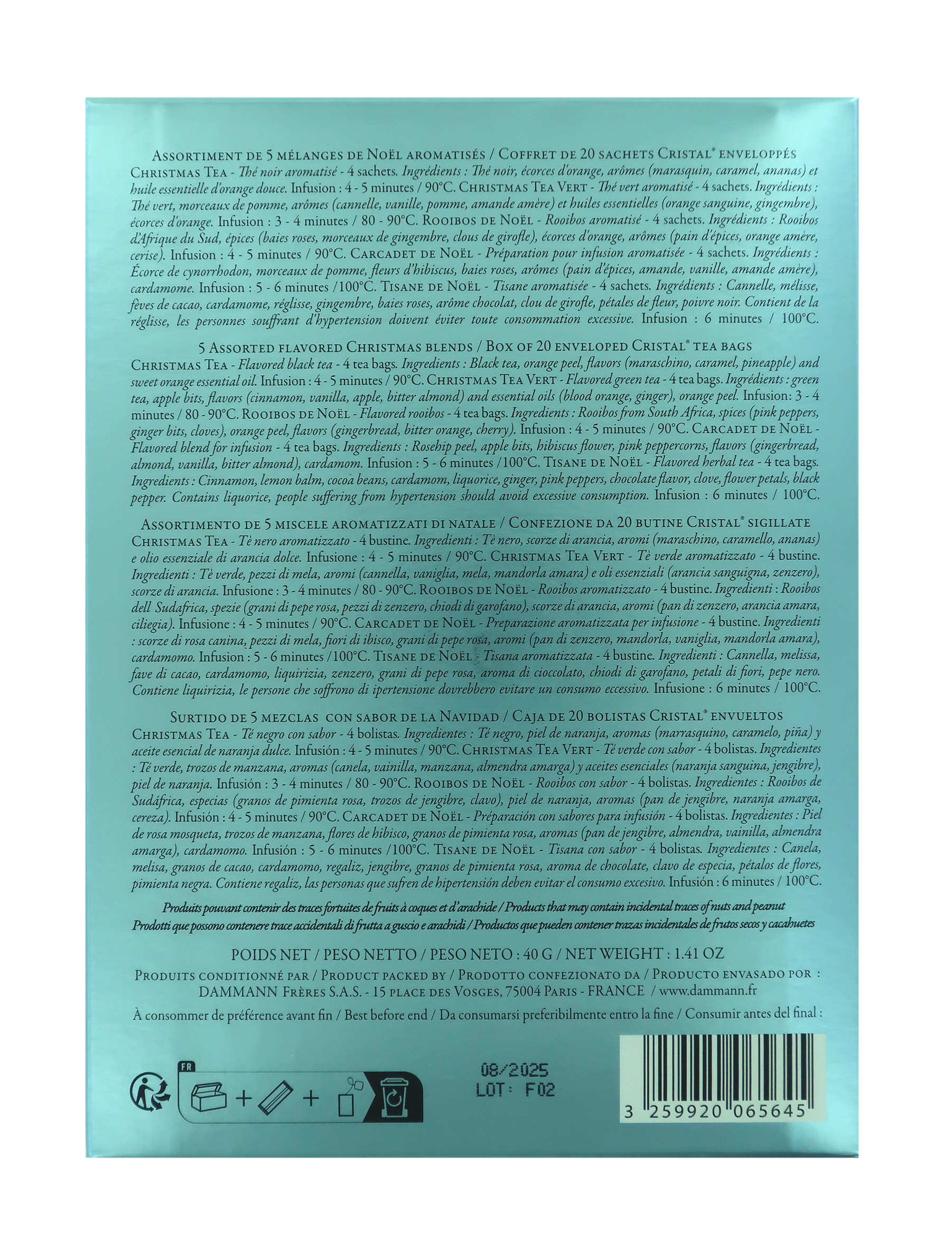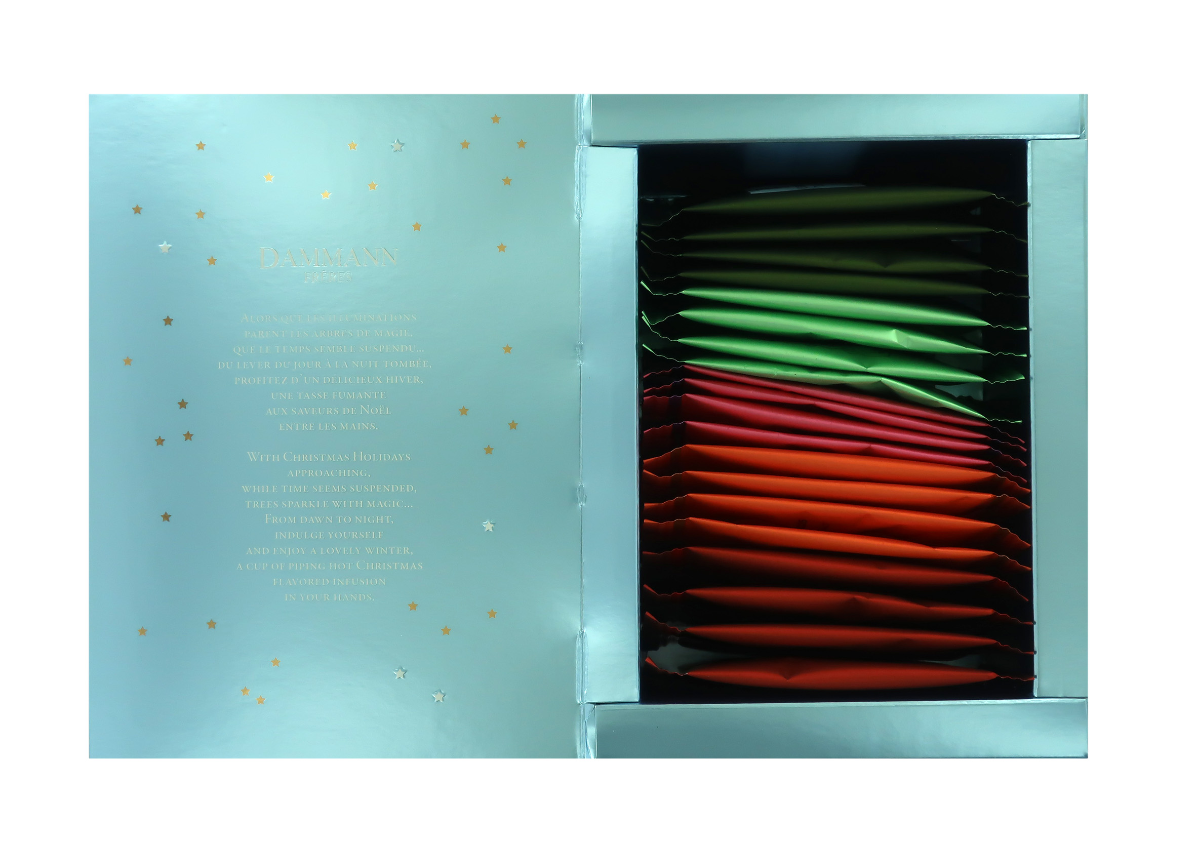 Assortimento di tè natalizio in elegante confezione regalo decorata da mille stelle per celebrare il magico Natale. Questa confezione per degustazione tè di Natale propone una attenta selezione di tea e infusi in sachets Cristal nei seguenti gusti: 4x Christmas Tea / 4x Christmas Tea Vert / 4x Rooibos de Noël / 4x Tisane de Noël / 4x Carcadet de Noël.