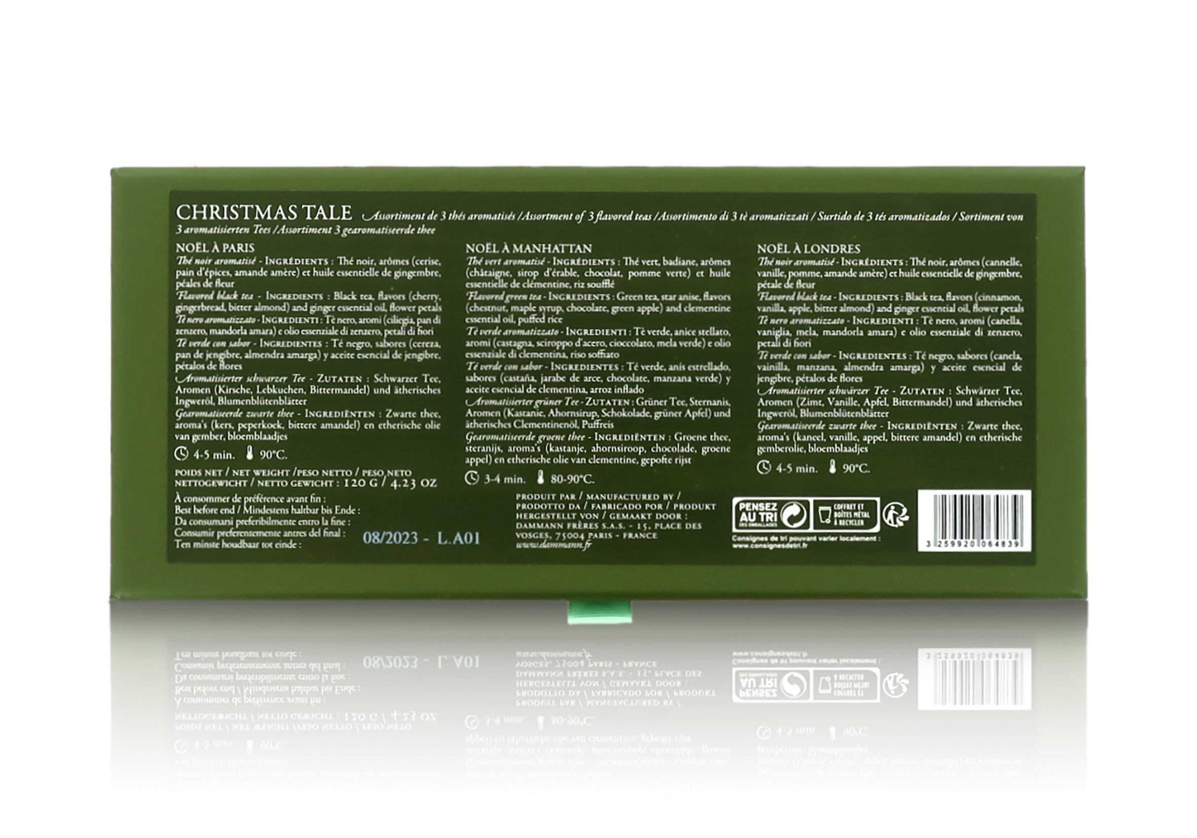 Cofanetto regalo "Christmas Tale" (Racconto di Natale) con un assortimento di 3 pregiate miscele per infusioni natalizie (2 tè neri e 1 tè verde) in formato sfuso. Le miscele incluse in questa idea regalo, perfetta per gli appassionati degli infusi d'autore, sono aromatizzate con gli inconfondibili profumi del Natale.