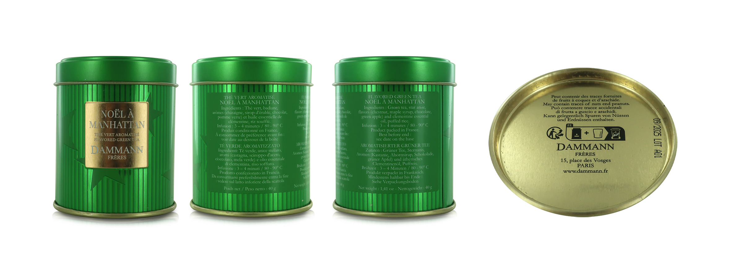 *N°618 - NOËL À MANHATTAN, tè verde aromatizzato - 40 g: tè verde, anice stellato, aromi (castagna, sciroppo d'acero, cioccolato, mela verde) e olio essenziale di clementina, riso soffiato;