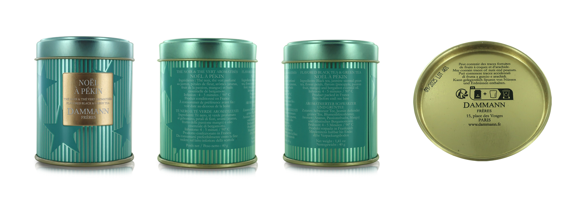 *N°181 - NOËL À PÉKIN, blend di tè nero e verde aromatizzato - 40 g: tè nero, tè verde al gelsomino, petali di fiori, aromi (ananas, frutto della passione, mango) e olio essenziale di bergamotto.
