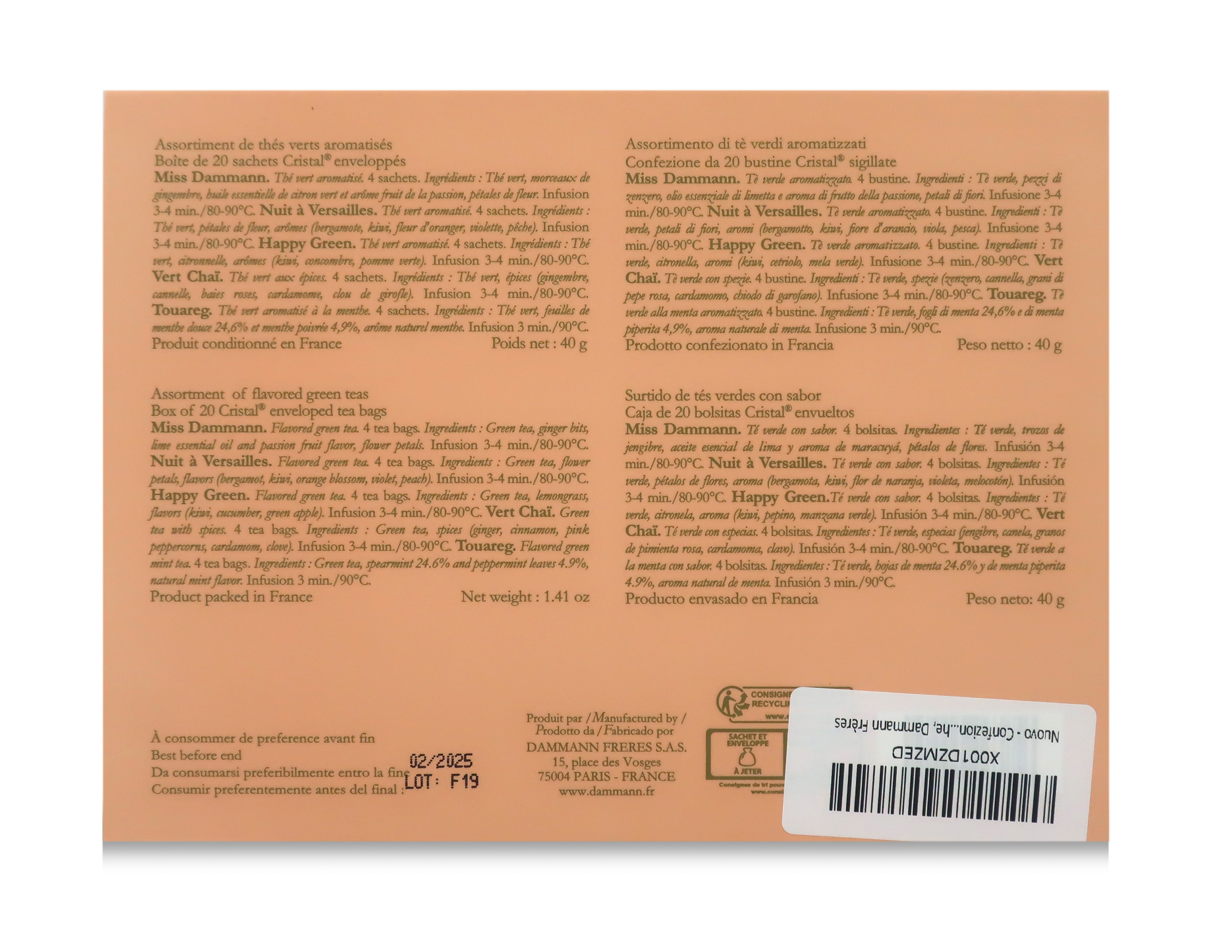 MISS DAMMANN (tè verde aromatizzato - 4 bustine) - Ingredienti : Tè verde, pezzi di zenzero, olio essenziale di limetta e aroma di frutto della passione, petali di fiori. // NUIT À VERSAILLES (tè verde aromatizzato - 4 bustine) - Ingredienti : Tè verde, petali di fiori, aromi (bergamotto, kiwi, fiori d'arancio, viola, pesca). // HAPPY GREEN (tè verde aromatizzato - 4 bustine) - Ingredienti : Tè verde, citronella, aromi (kiwi, cetriolo, mela verde). // TOUAREG (tè verde menta aromatizzato - 4 bustine) - Ingredienti : Tè verde, fogli di menta 24,6%e di menta piperita 4,9%, aroma naturale di menta. // VERT CHAÏ (tè verde con spezie - 4 bustine) - Ingredienti : Tè verde, spezie (zenzero, cannella, grani di pepe rosa, cardamomo, chiodo di garofano).