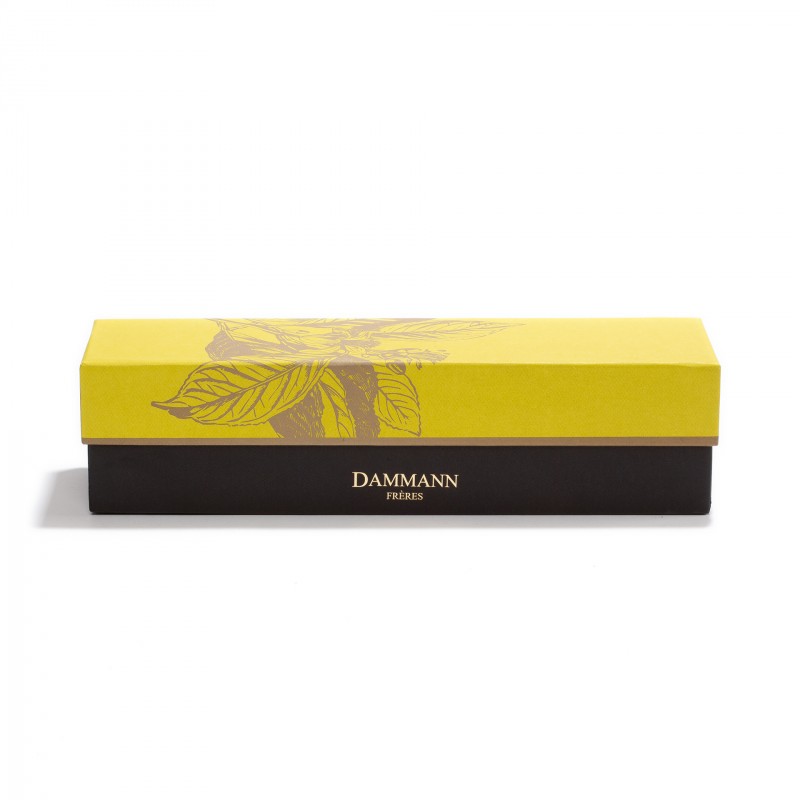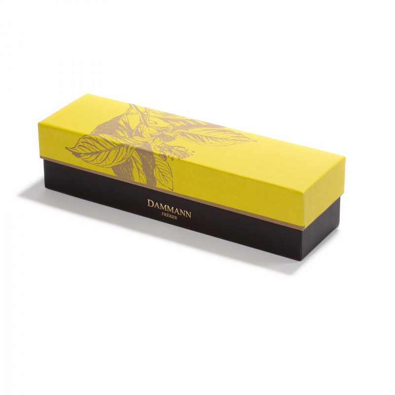 La confezione regalo "Éclats" di Dammann Frères include una graziosa collezione di 4 tè diversi agli agrumi. Il cofanetto, di forma rettangolare e dal coperchio di un bellissimo giallo acceso, contiene 4 carinissimi barattoli di latta (uno per ogni varietà di tè) e un infusore di metallo.