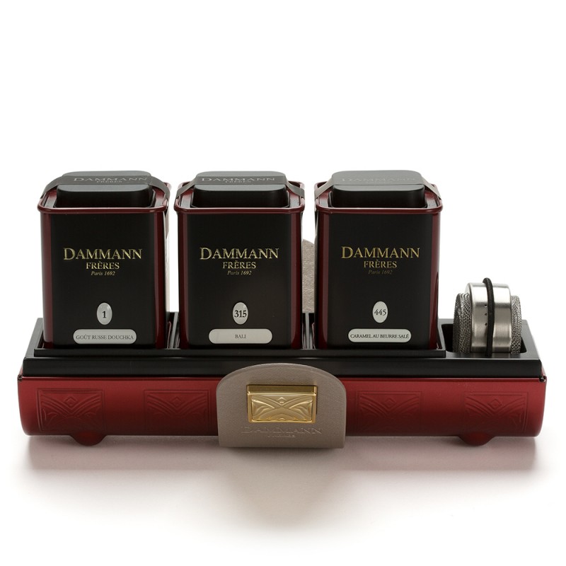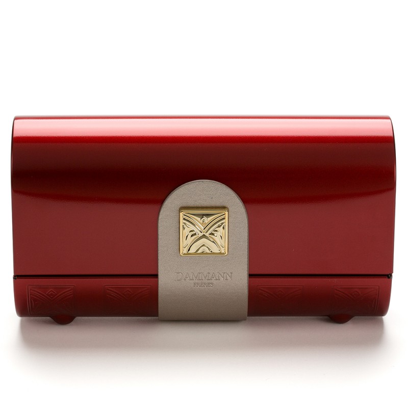 La confezione regalo "Amarante" di Dammann Frères include 3 diversi tè aromatizzati. Il cofanetto metallico, di un elegante color rosso amaranto, vanta una bellissima forma a scrigno con rifiniture di alta qualità. Si tratta di una raffinata idea regalo per gli amanti del tè. Al suo interno custodisce 3 carinissimi barattoli di latta (uno per ogni varietà di tè) e un infusore di metallo.