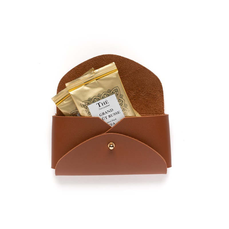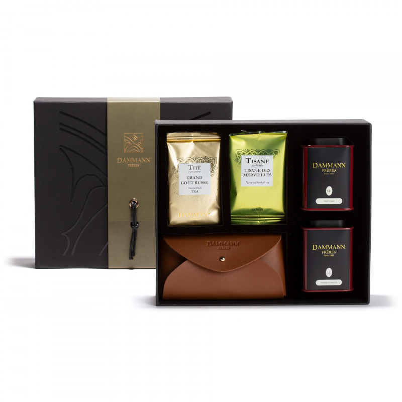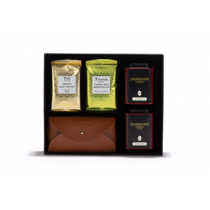 Elegante confezione regalo "Excursion" di colore nero. Custodisce 3 varianti diverse di tè e 1 tisana (di cui 2 in barattoli di latta e 2 in bustine Cristal incartate singolarmente). La confezione regalo si completa con una custodia in similpelle, utile a contenere le vostre bustine di tè preferite.