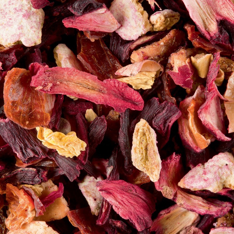 Tè n° 405 - Carcadet Provence: carcadè ai fiori di ibisco, buccia di rosa canina, pezzetti di mela, scorza d'arancia, aromi (albicocca e pesca), petali di fiori, 50 g.
