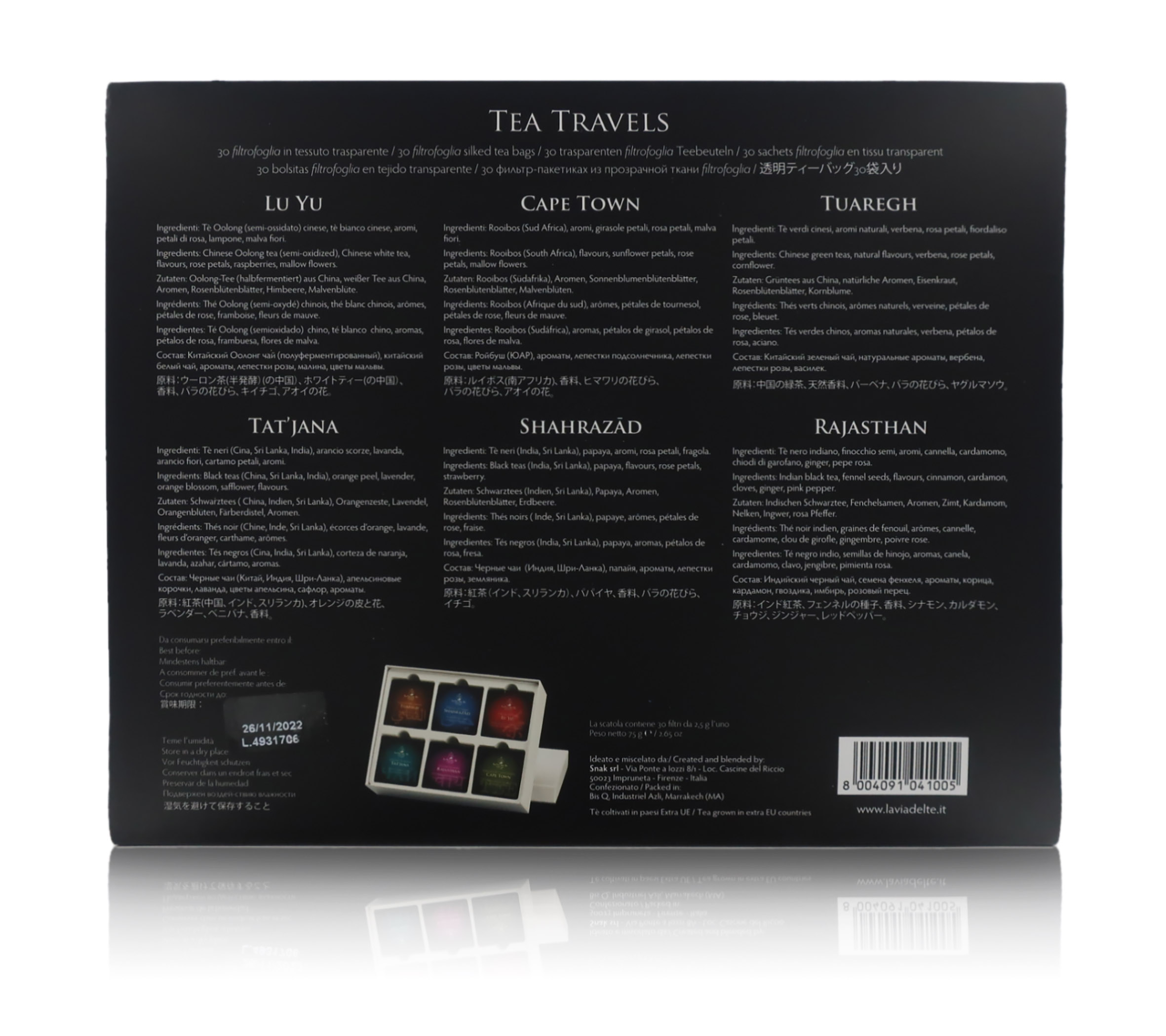 Il cofanetto include le seguenti tipologie di miscele di tè: RAJASTHAN (miscela indiana di tè nero e spezie, ottima se degustata con zucchero e latte); SHAHRAZAD (tè ispirato alla bella principessa delle "Mille e una Notte" e al fascino dell’antica Persia creato con raffinati tè neri), TUAREGH (tè verdi al profumo di menta "Nanah" e agrumi), LU YU (tè Oolong, semi-ossidato alle gemme preziose del tè bianco imperiale Yin Zhen, "Aghi d’Argento"); CAPE TOWN (rooibos e petali di rosa, malva e girasole, senza caffeina); TAT'JANA ("tè alla russa" realizzato con tè neri d’India, Ceylon e Cina arricchiti da arancio e bergamotto).