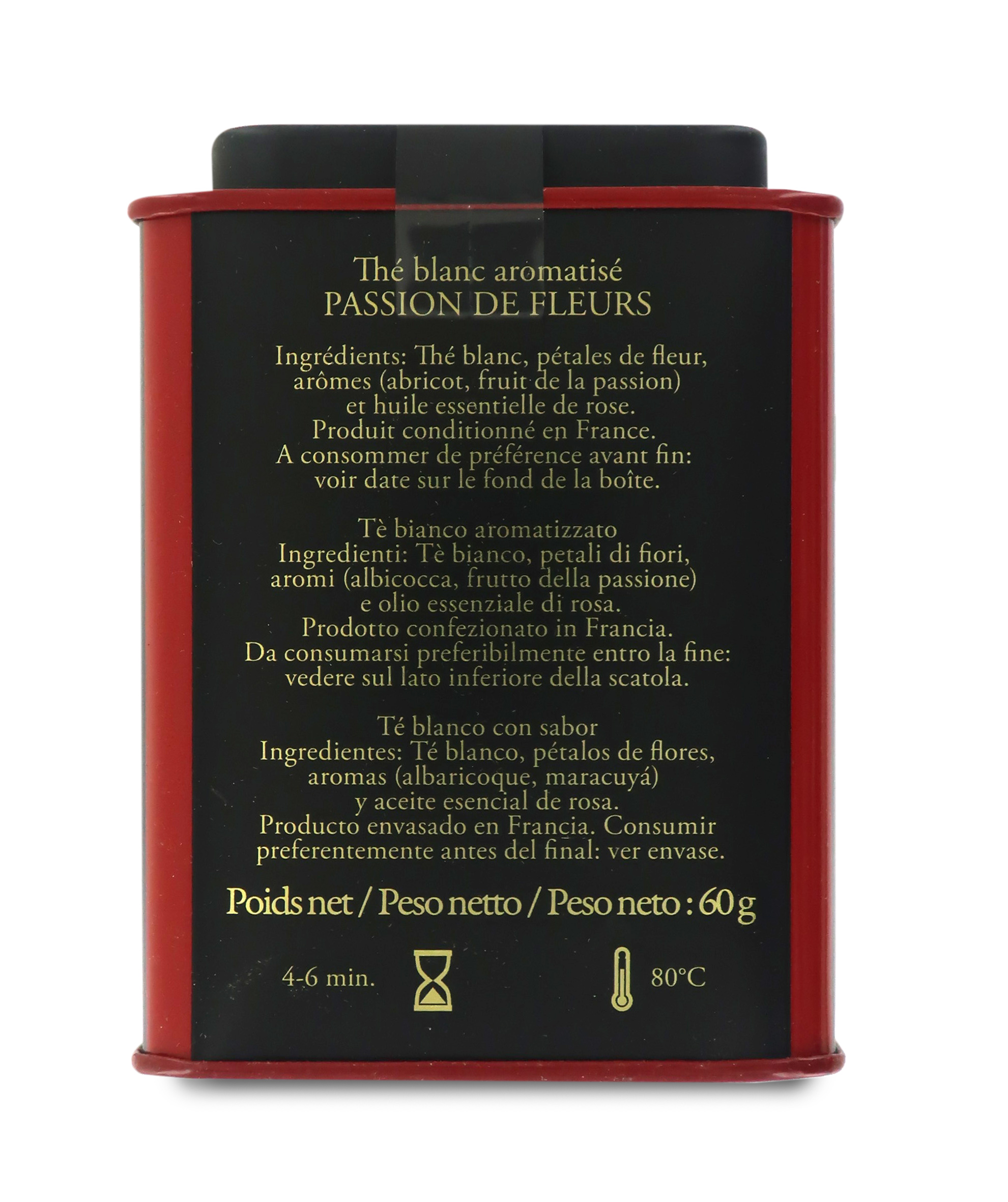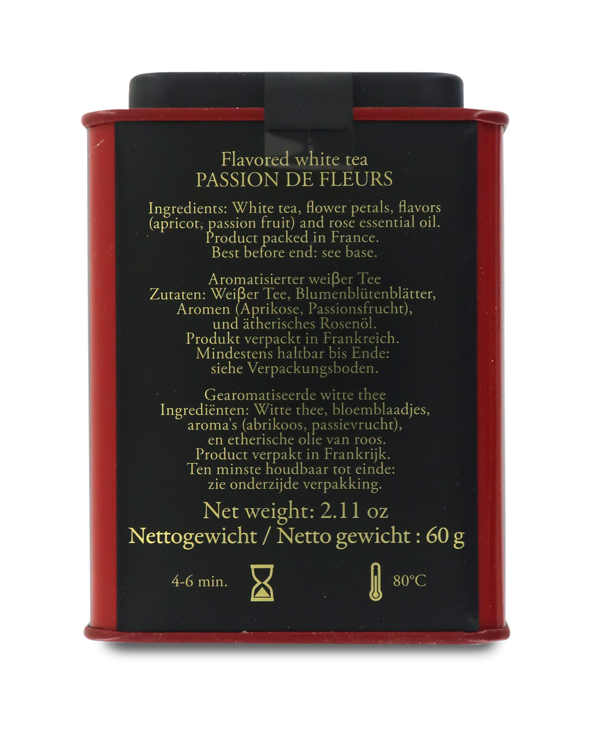 "Passion de Fleurs" è un delicato tè bianco che vanta aromi di rosa, albicocca e passiflora. I petali di rosa in esso contenuto gli conferiscono una ancora più accentuata nota floreale.