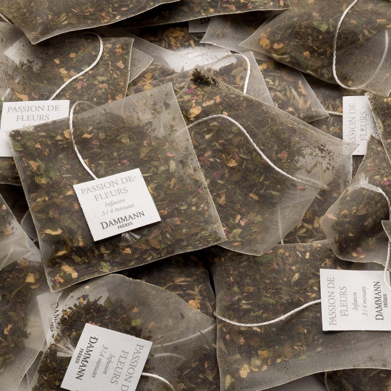 Il tè bianco alla rosa "Passion de Fleurs" di Dammann Frères è contenuto in esclusive e pratiche bustine "Cristal" incartate singolarmente.