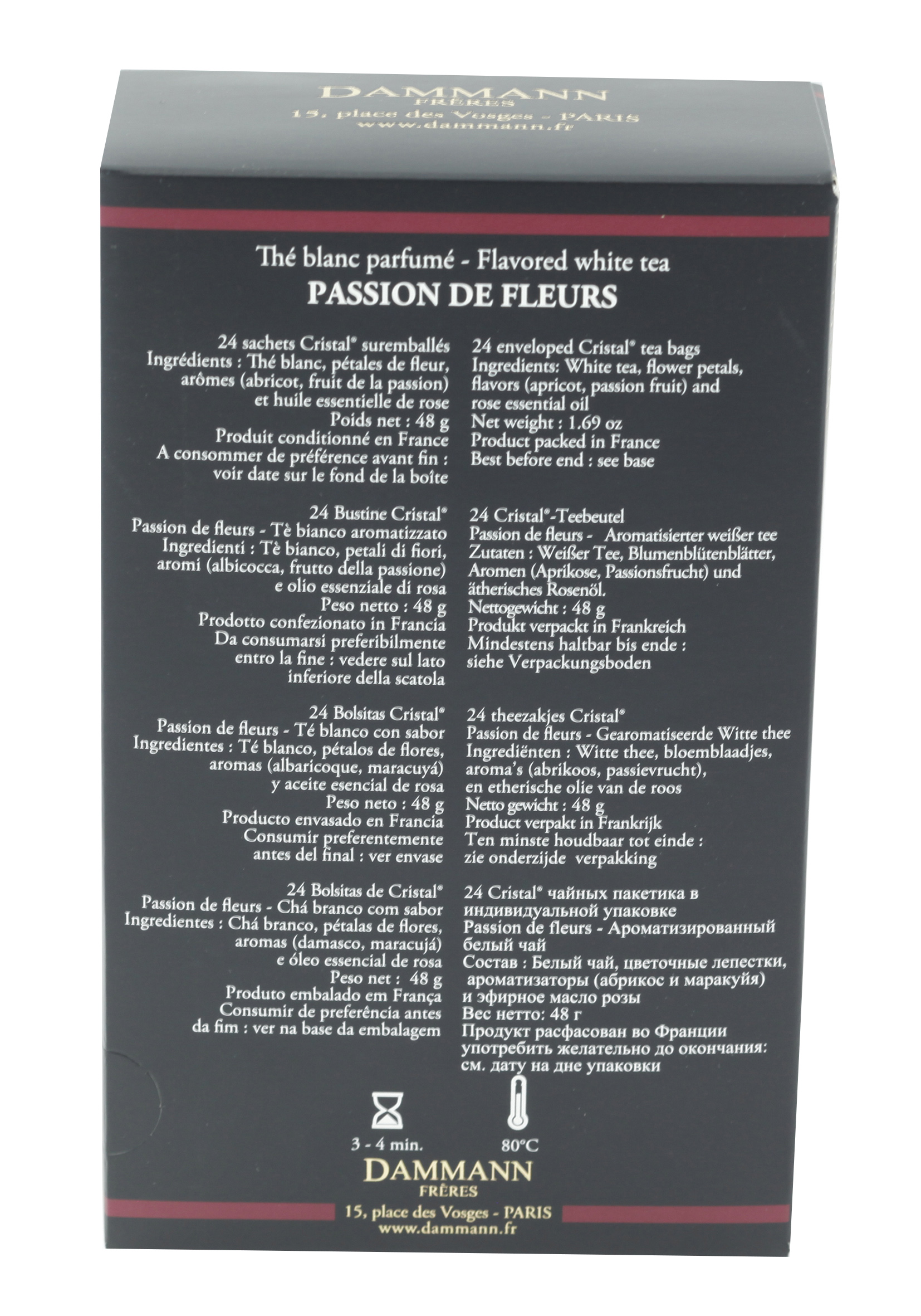 "Passion de Fleurs" è un delicato tè bianco che vanta aromi di rosa, albicocca e passiflora. I petali di rosa in esso contenuto gli conferiscono una ancora più accentuata nota floreale.