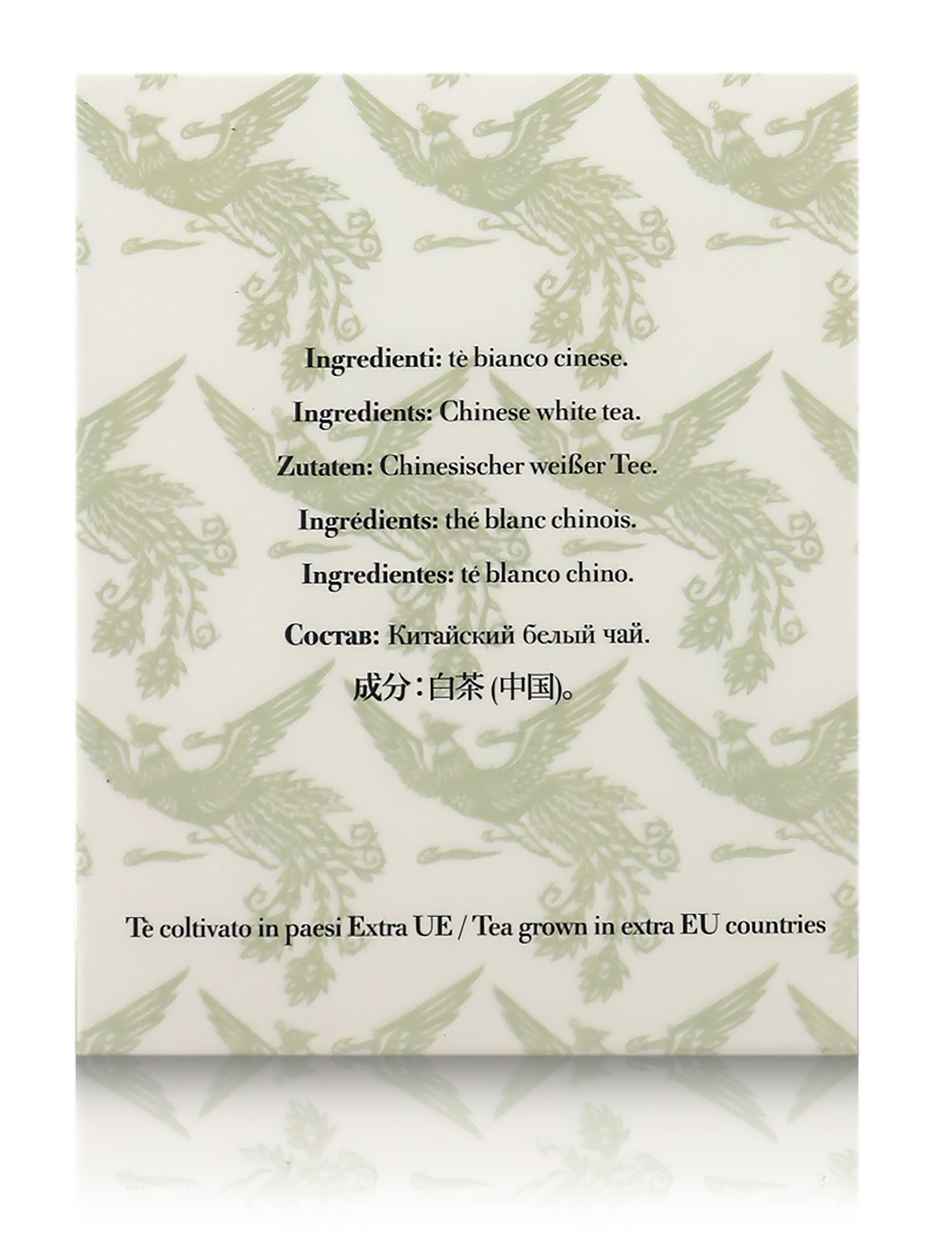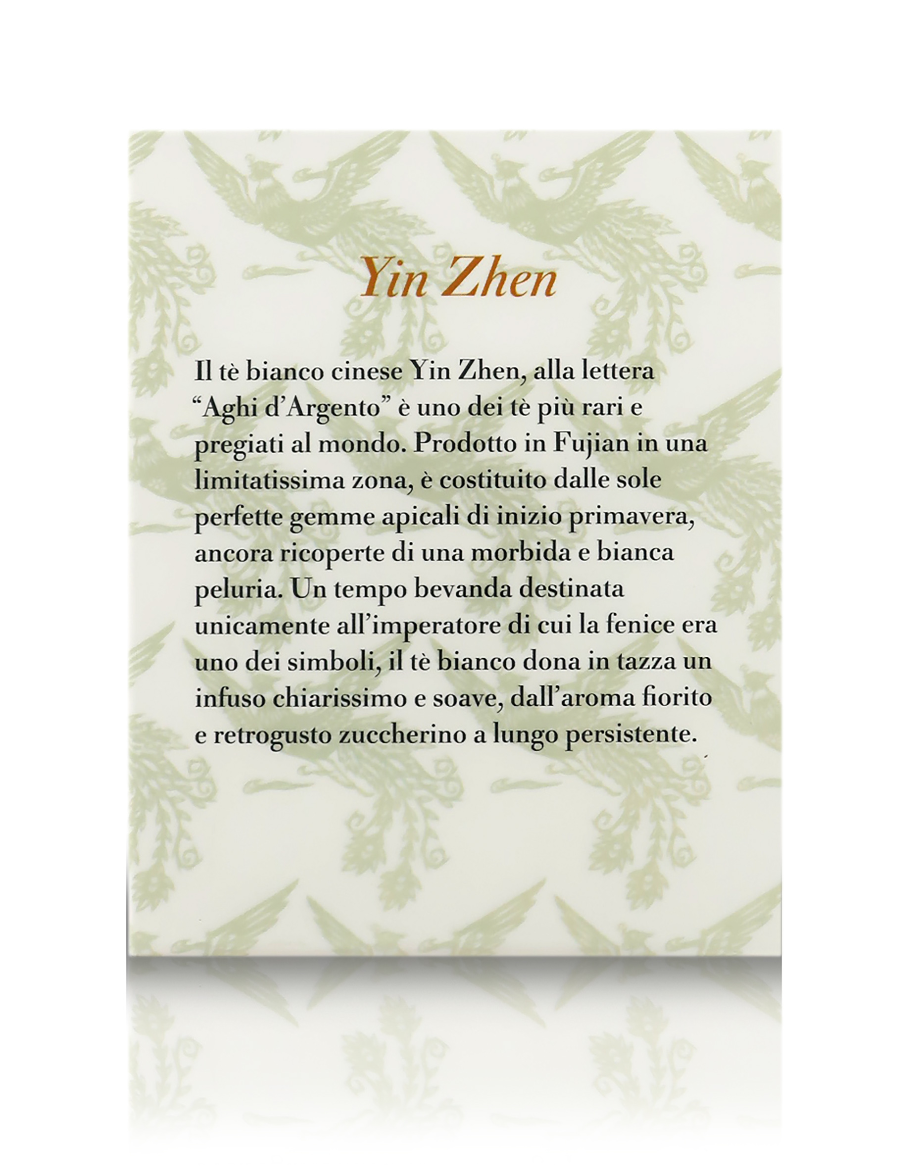 Il nome di questo tè bianco cinese "Yin Zhen" significa "Aghi d'Argento" e si tratta di uno dei tè più rari e pregiati al mondo. Prodotto in una contenuta area del Fujian, si compone esclusivamente di gemme apicali perfette (tip) d'inizio primavera. Le gemme sono talmente giovani che sono ancora ricoperte di una bianca peluria. In passato, questa tipologia di tè era riservata all'imperatore. In tazza, il tè bianco dona un infuso chiarissimo e soave, dall'aroma piacevolmente fiorito e dal retrogusto dolce.