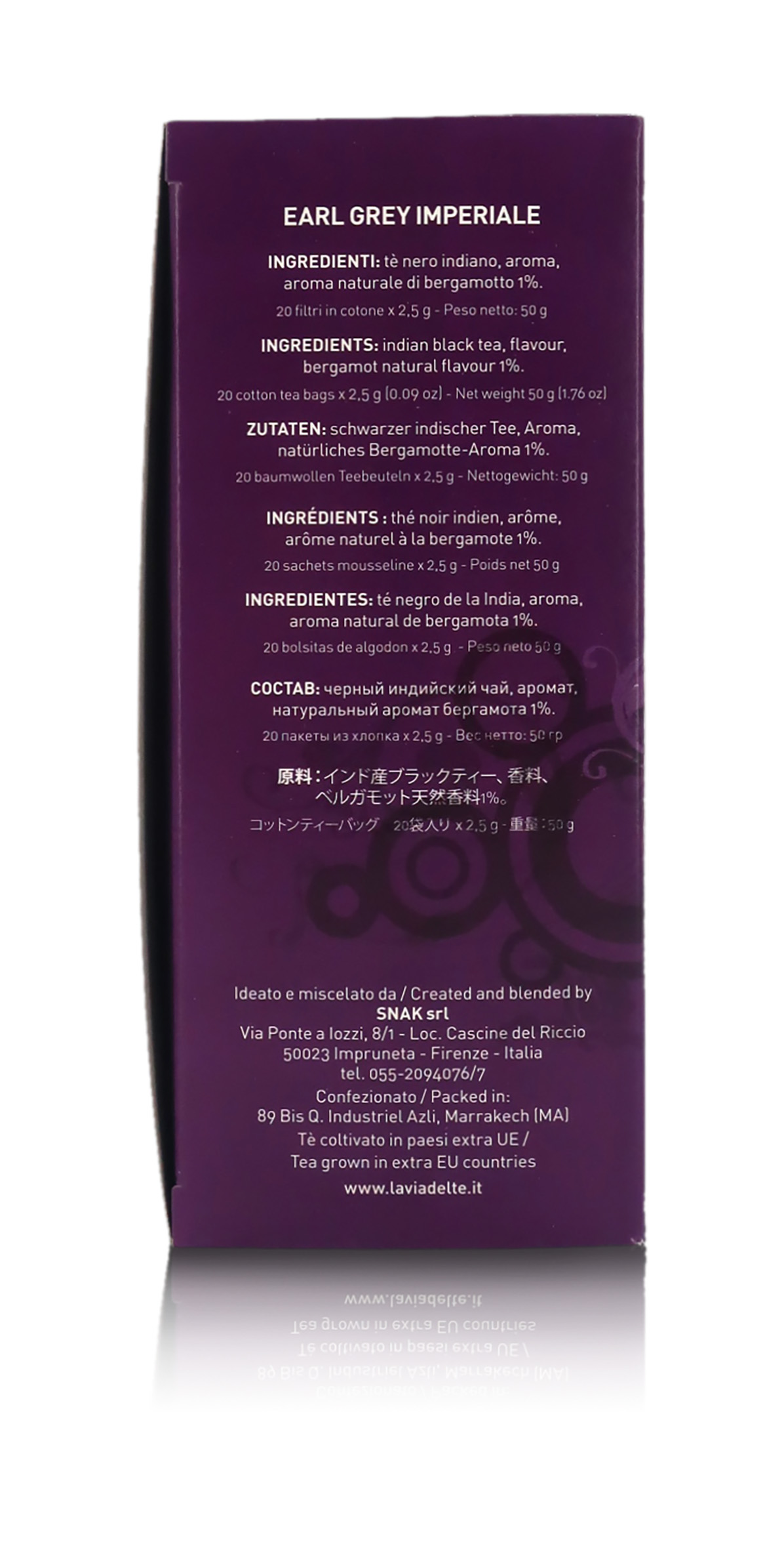 Ingredienti: Tè nero indiano, aromi, aroma naturale di bergamotto 1%.