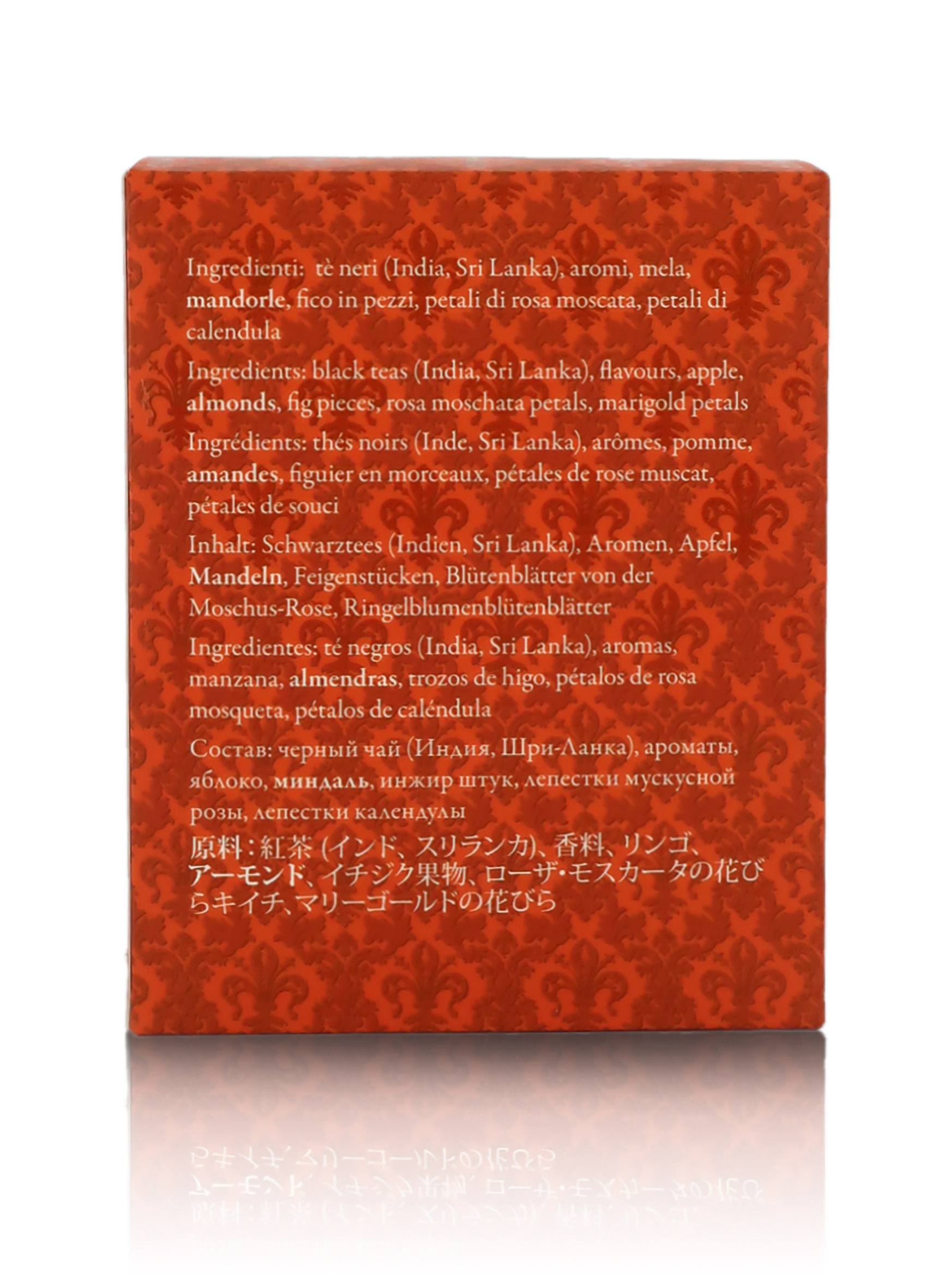 Ingredienti: Tè nero indiano, tè nero, aromi, mela, mandorle, fico in pezzi, petali di rosa moscata, calendula.