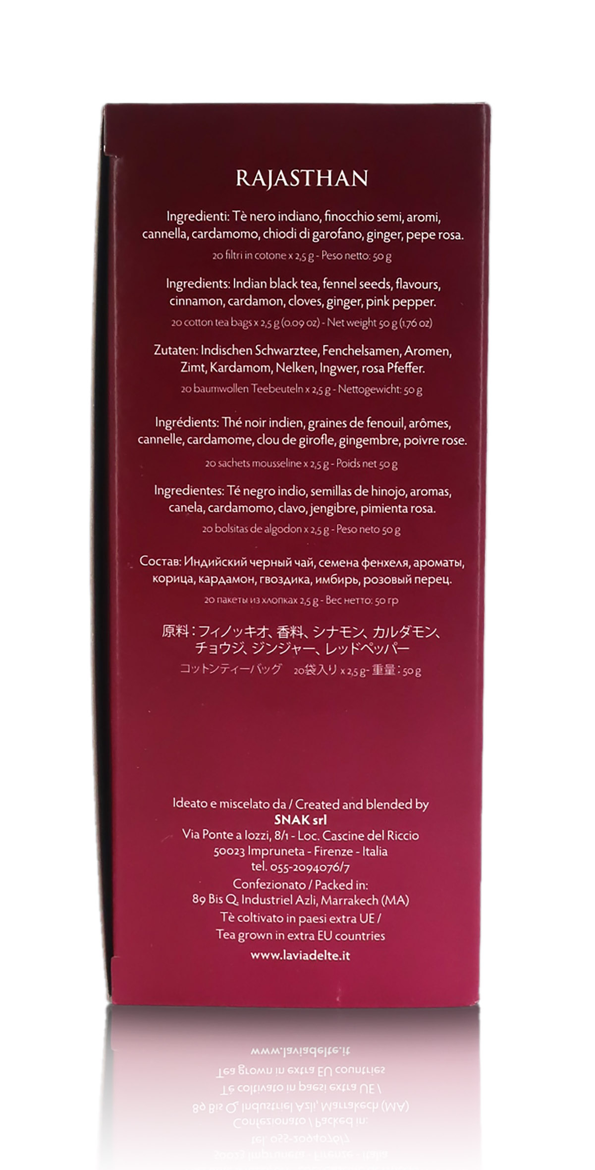 Ingredienti: tè nero indiano, semi di finocchio, aromi, cannella, cardamomo, chiodo di garofano, ginger, pepe rosa.