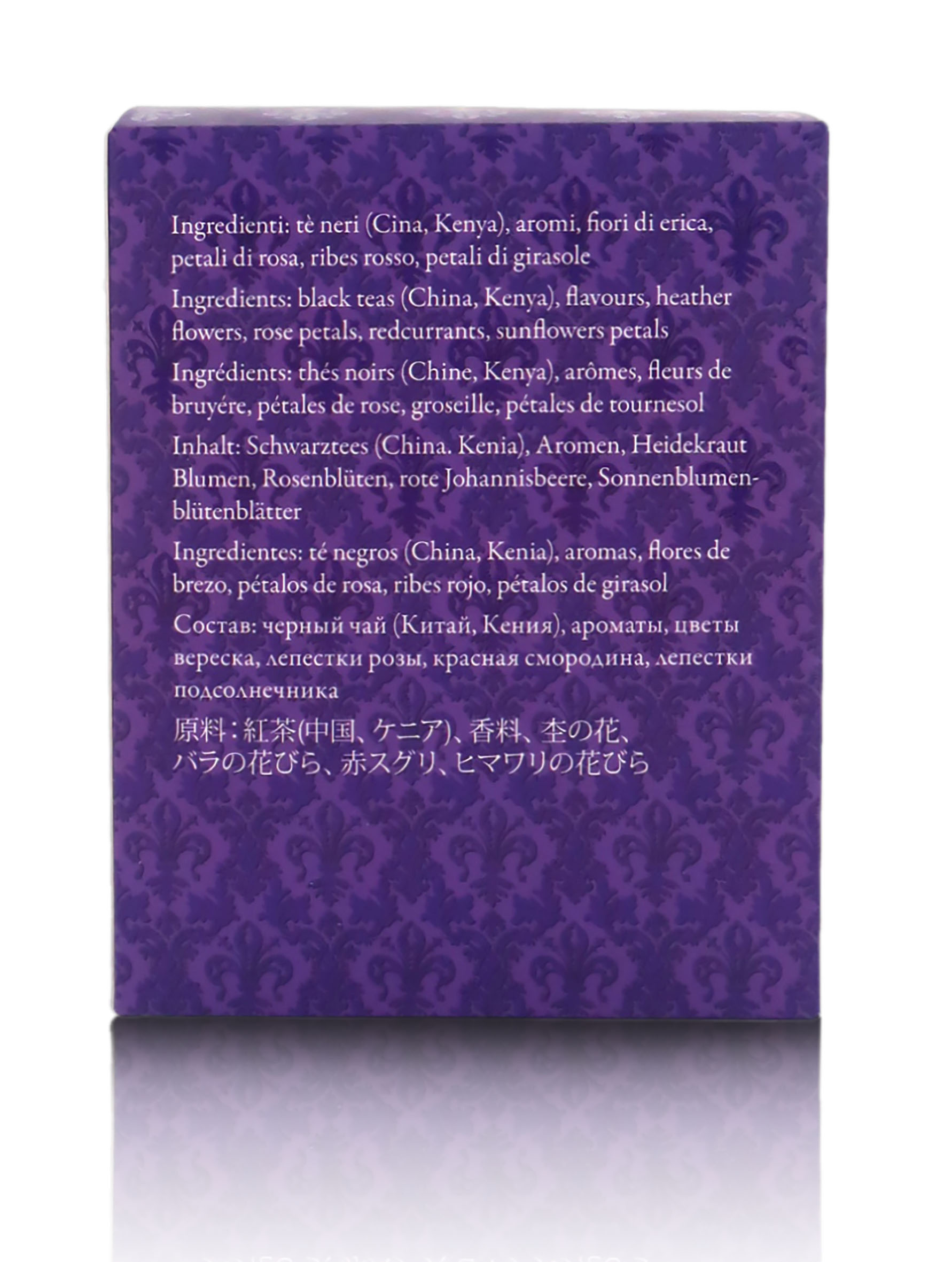 Ingredienti: Tè nero cinese Rose Congou, tè nero Kenya Marinyn, aromi, erica, petali di rosa, ribes rosso, petali di girasole.