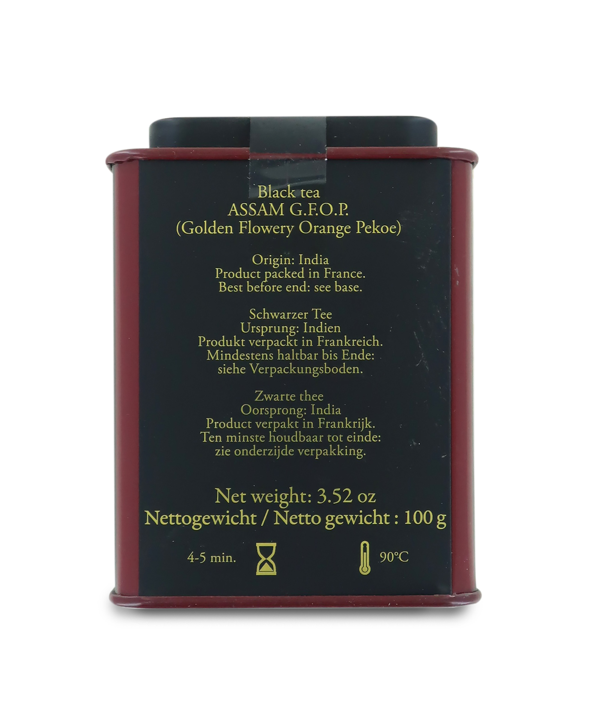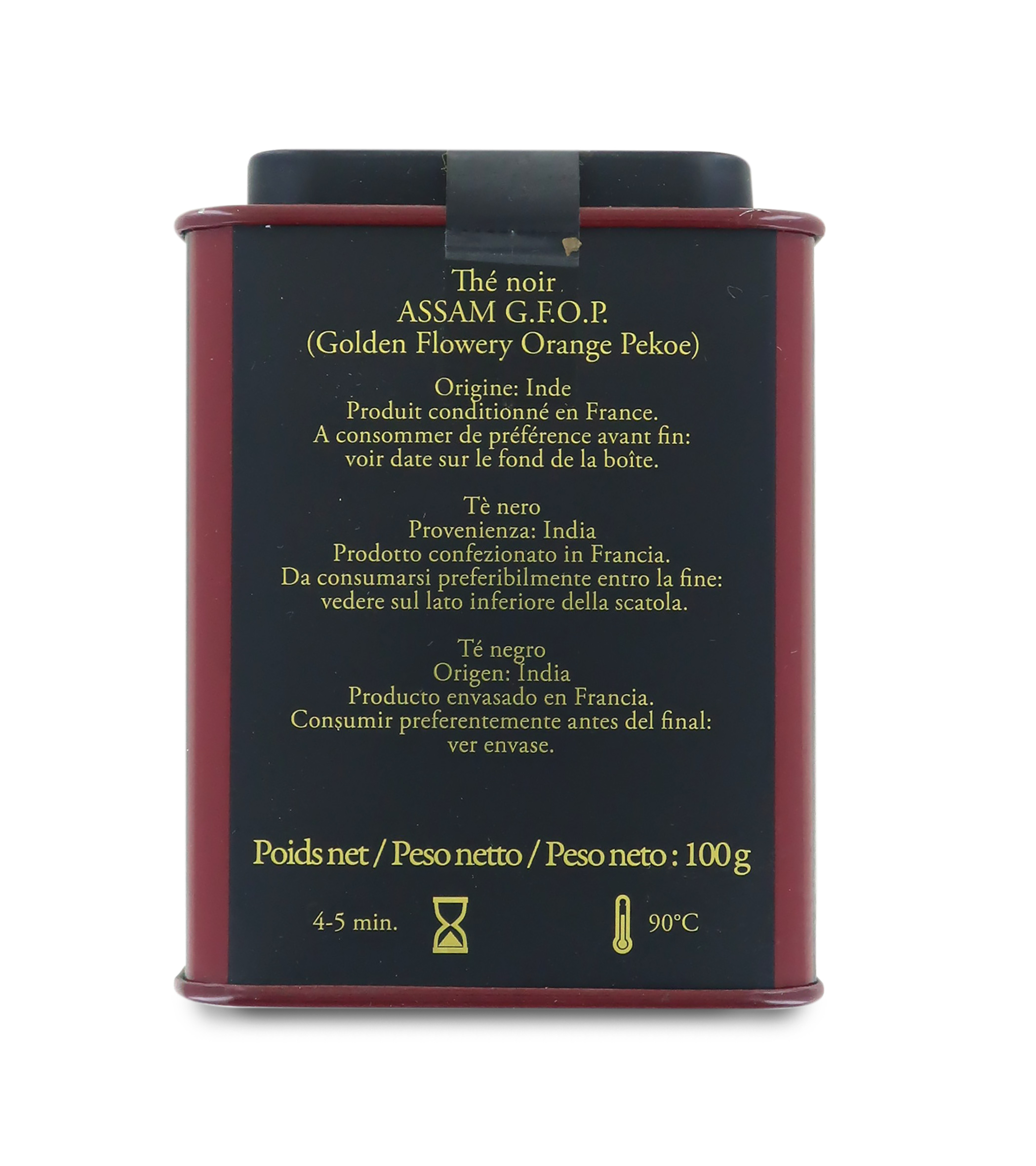 Tè nero indiano "Assam", di qualità superiore, con belle foglie intere, ricco di germogli di color oro, caratteristica che lo fanno certificare come tè G.F.O.P. (Golden Flowery Orange Pekoe).