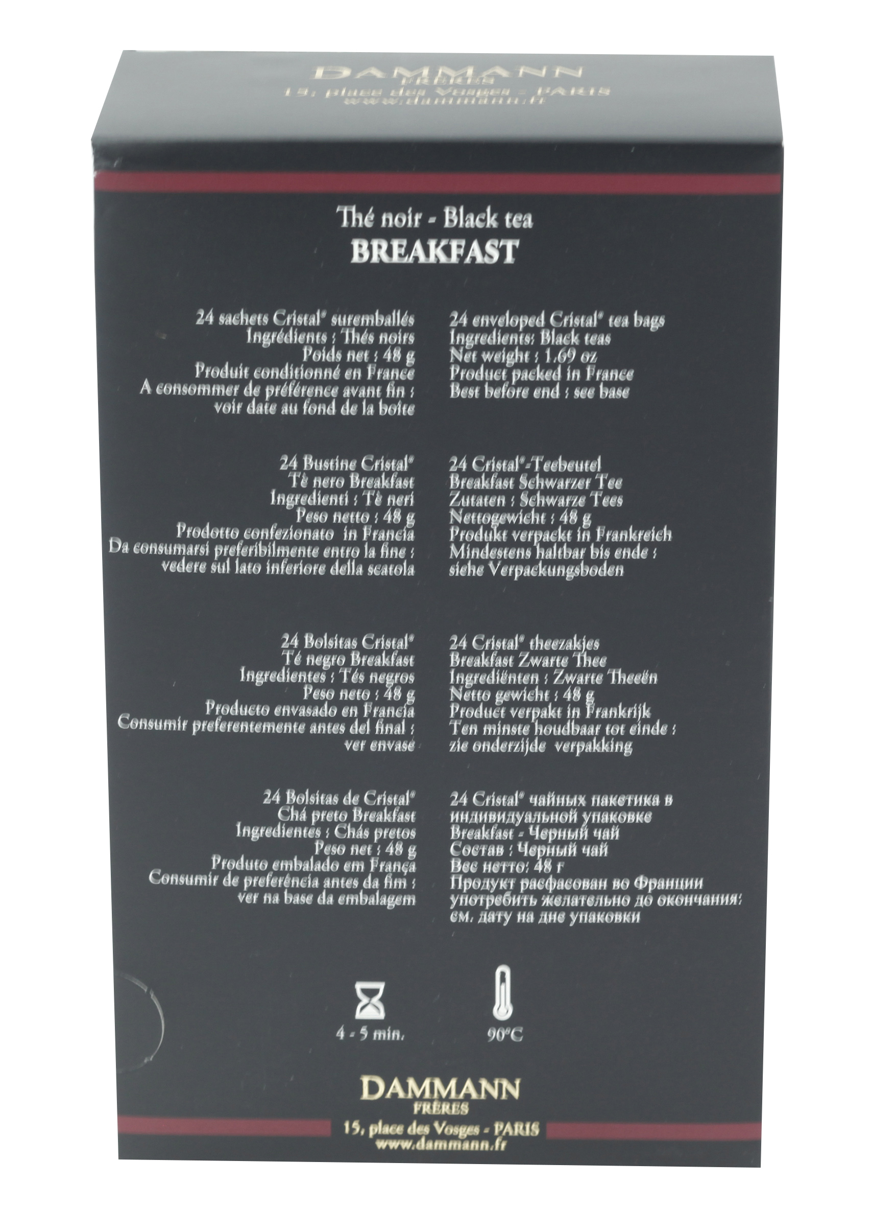 Questo blend di tè nero "Breakfast" di Dammann Frerès è contenuto in esclusive e pratiche bustine "Cristal" incartate singolarmente.