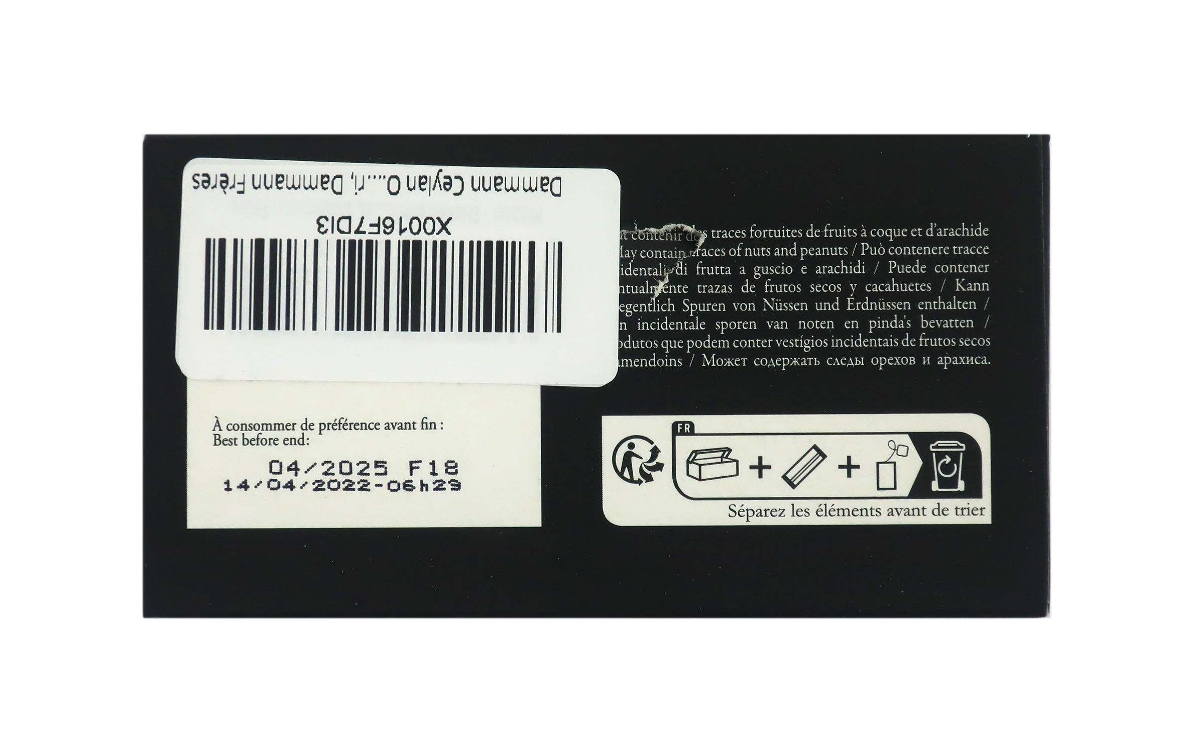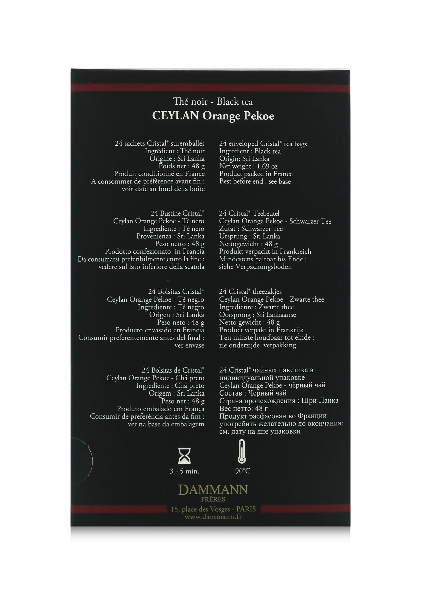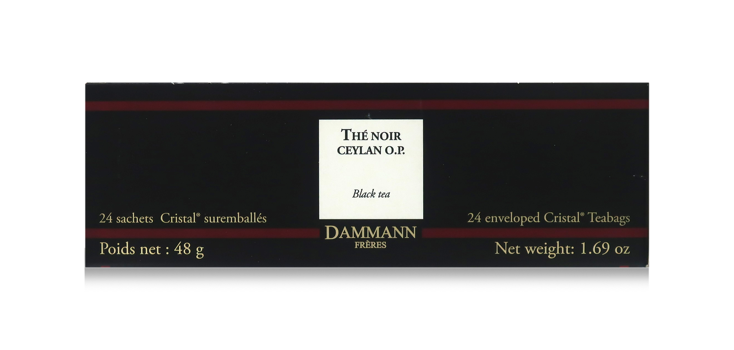Il tè Ceylan O.P. (Ceylon) presenta foglie estremamente regolari, che creano un infuso delicatamente profumato con belle note legnose. È il tè perfetto da gustare al pomeriggio. Il tè nero Ceylan OP è contenuto in esclusive e pratiche bustine "Cristal" incartate singolarmente. La gloriosa storia di Dammann Frères comincia nel 1692 con l'autorizzazione di Luigi XIV a importare tè in Francia. Dopo più di tre secoli, Dammann Frères continua a essere riconosciuta come una istituzione, commercializzando più di 300 varianti di tè pregiato in vari formati, tra cui pacchetti di tè sfuso, elegantissime confezioni di latta o raffinate bustine Cristal.