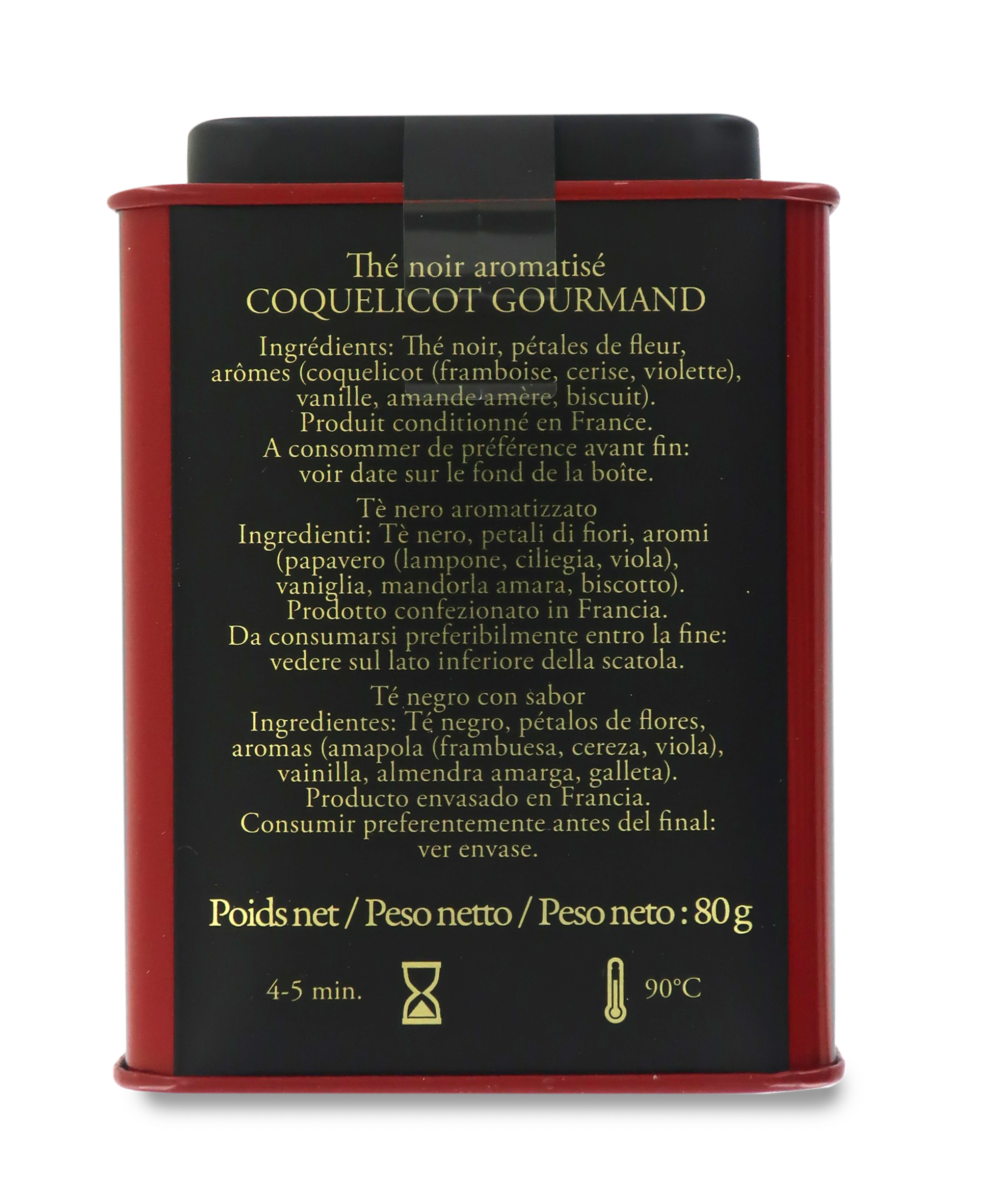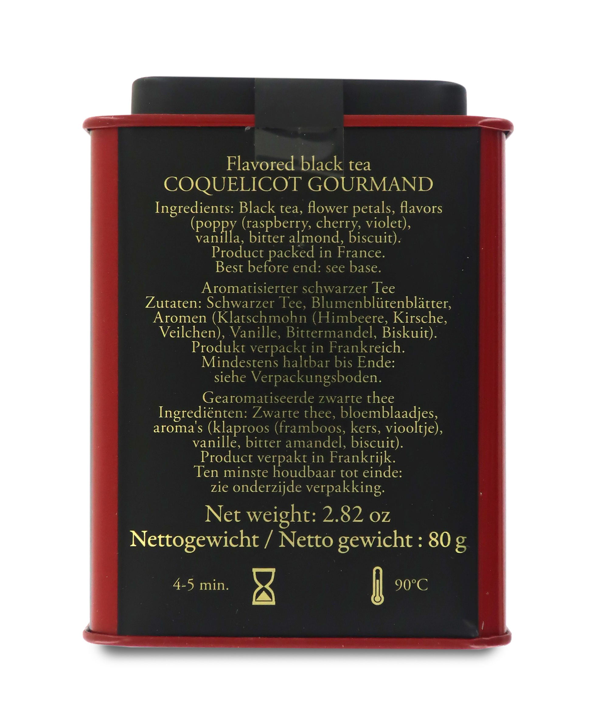 "Coquelicot Gourmand" è una miscela di tè neri che unisce aromi di papavero, biscotto e marzapane in una deliziosa ricetta gourmet. Nel bouquet di sapori, si distingue il lampone come principale, a cui si accompagnano note complementari di ciliegia, viola, vaniglia, mandorla e biscotto.