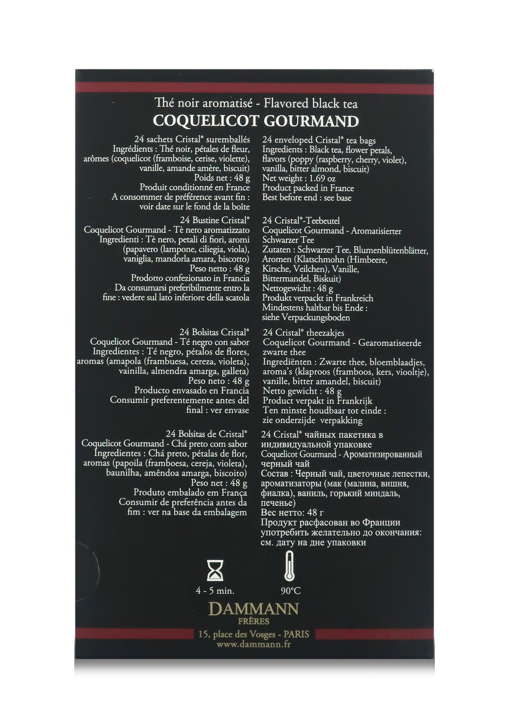 Il tè nero Coquelicot Gourmand è contenuto in esclusive e pratiche bustine "Cristal" incartate singolarmente.