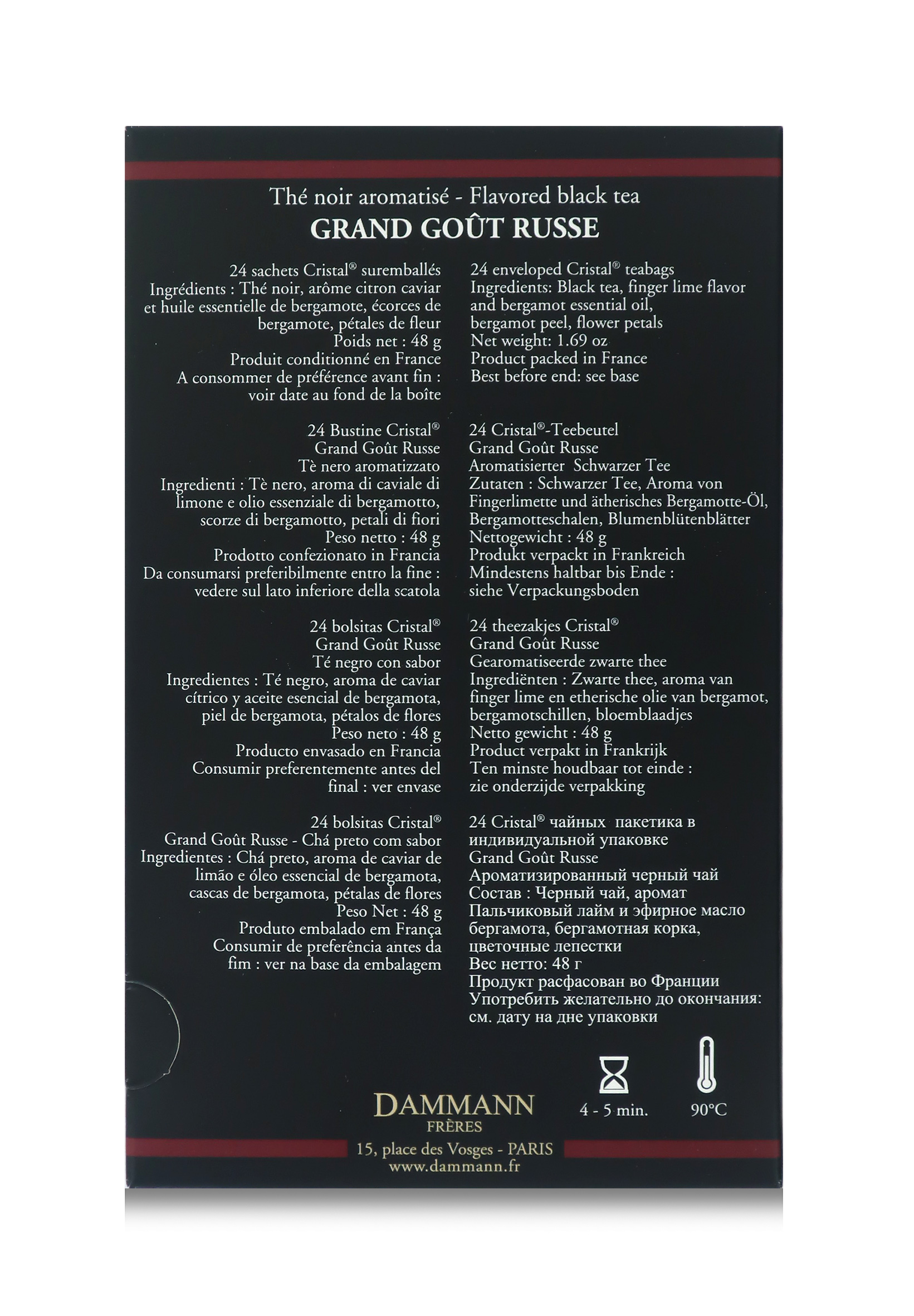 Il tè nero agli agrumi Grand Goût Russe è contenuto in esclusive e pratiche bustine "Cristal" incartate singolarmente.