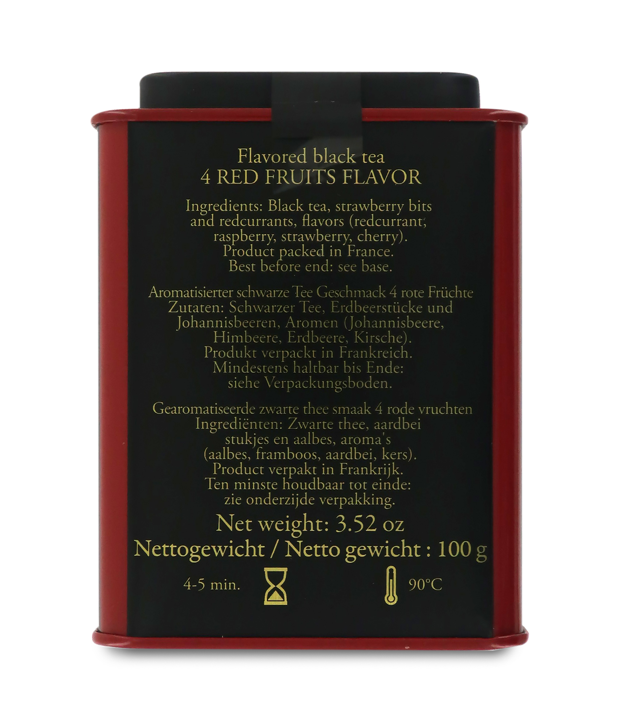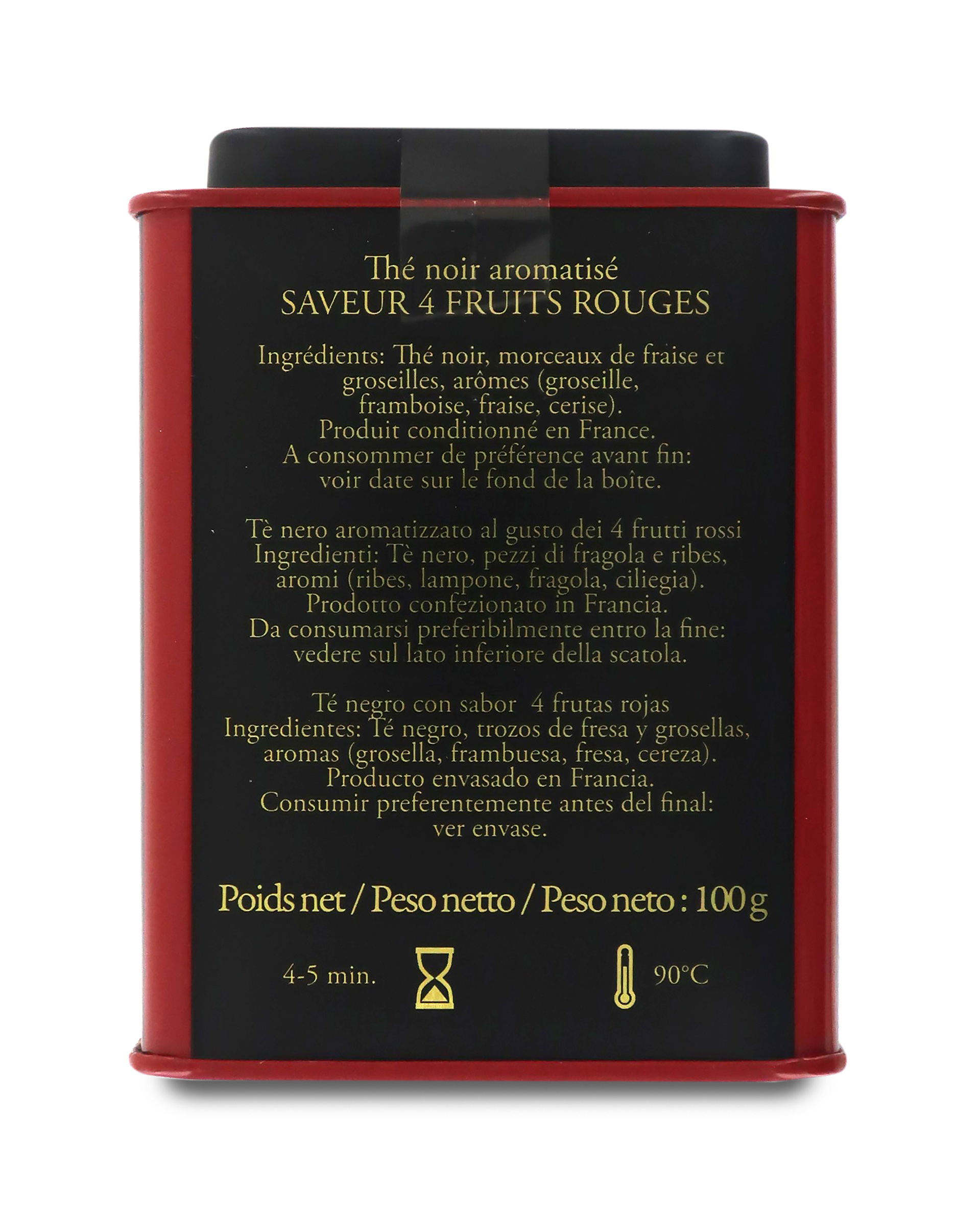 Come annunciato dal suo nome, "Quatre Fruits Rouges" è un tè nero che vanta una forte nota dominante di frutti rossi, con sapore principale di ciliegia. Gusti secondari includono fragola, lampone e ribes rosso.