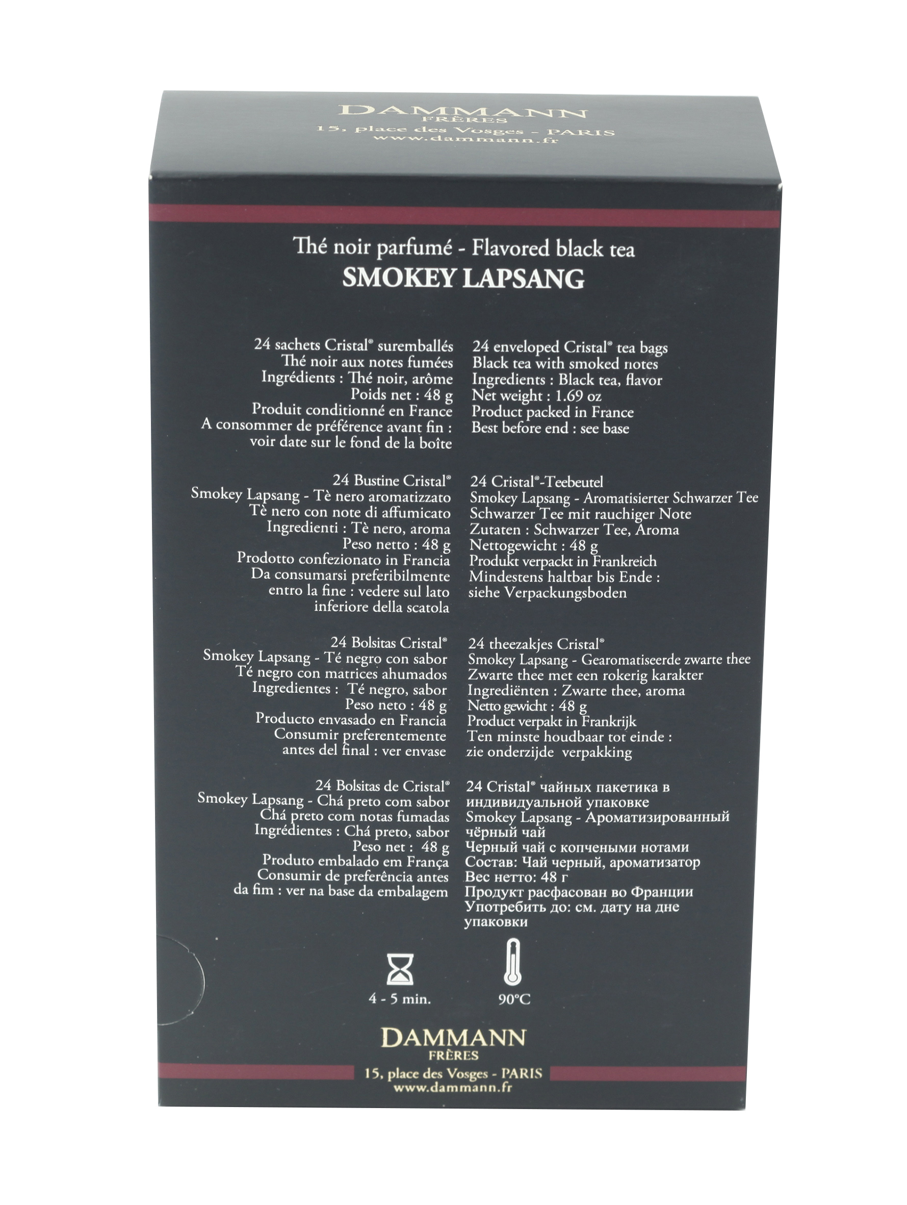 Questo tè nero affumicato Dammann Frerès è contenuto in esclusive e pratiche bustine "Cristal" incartate singolarmente.