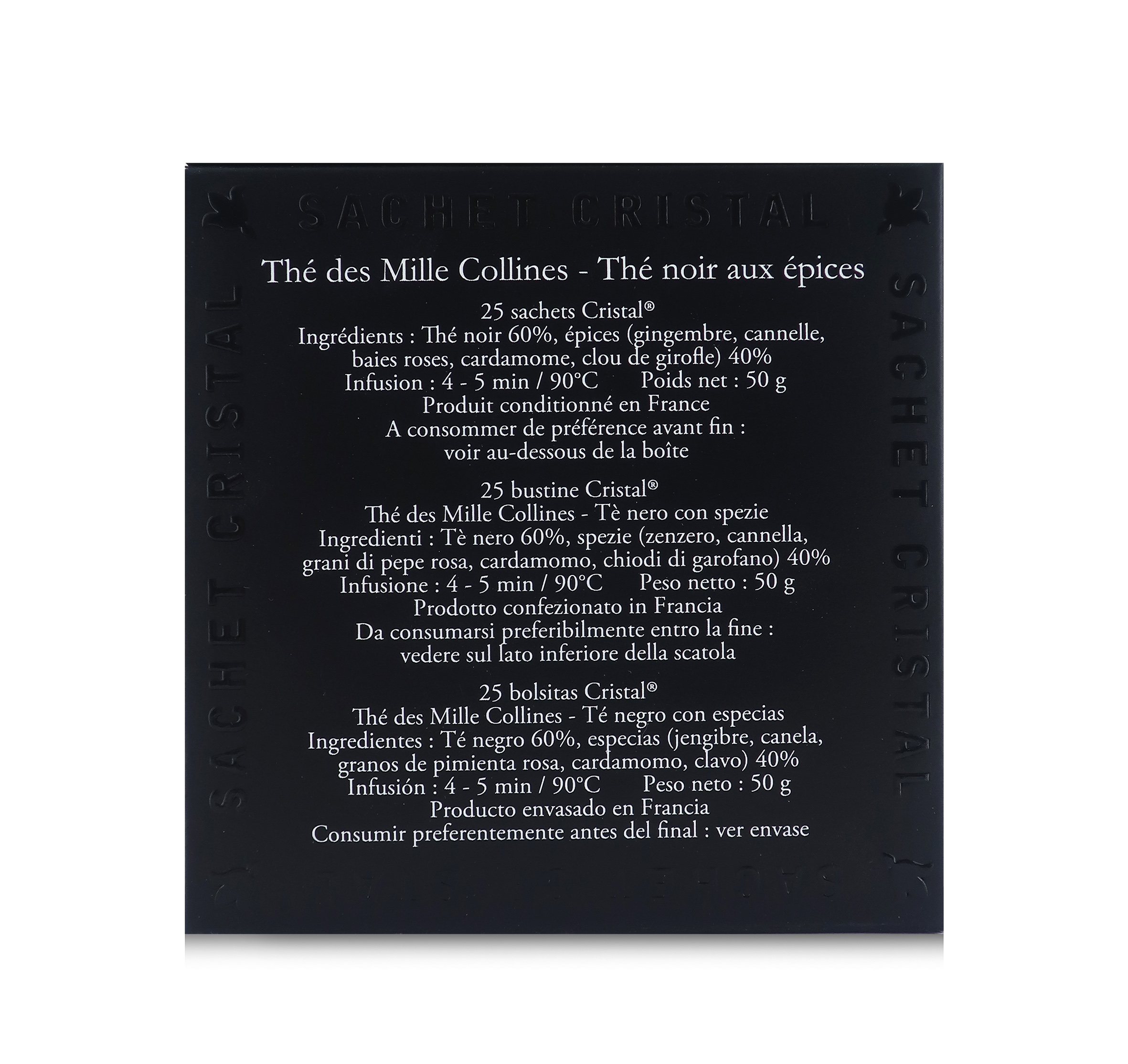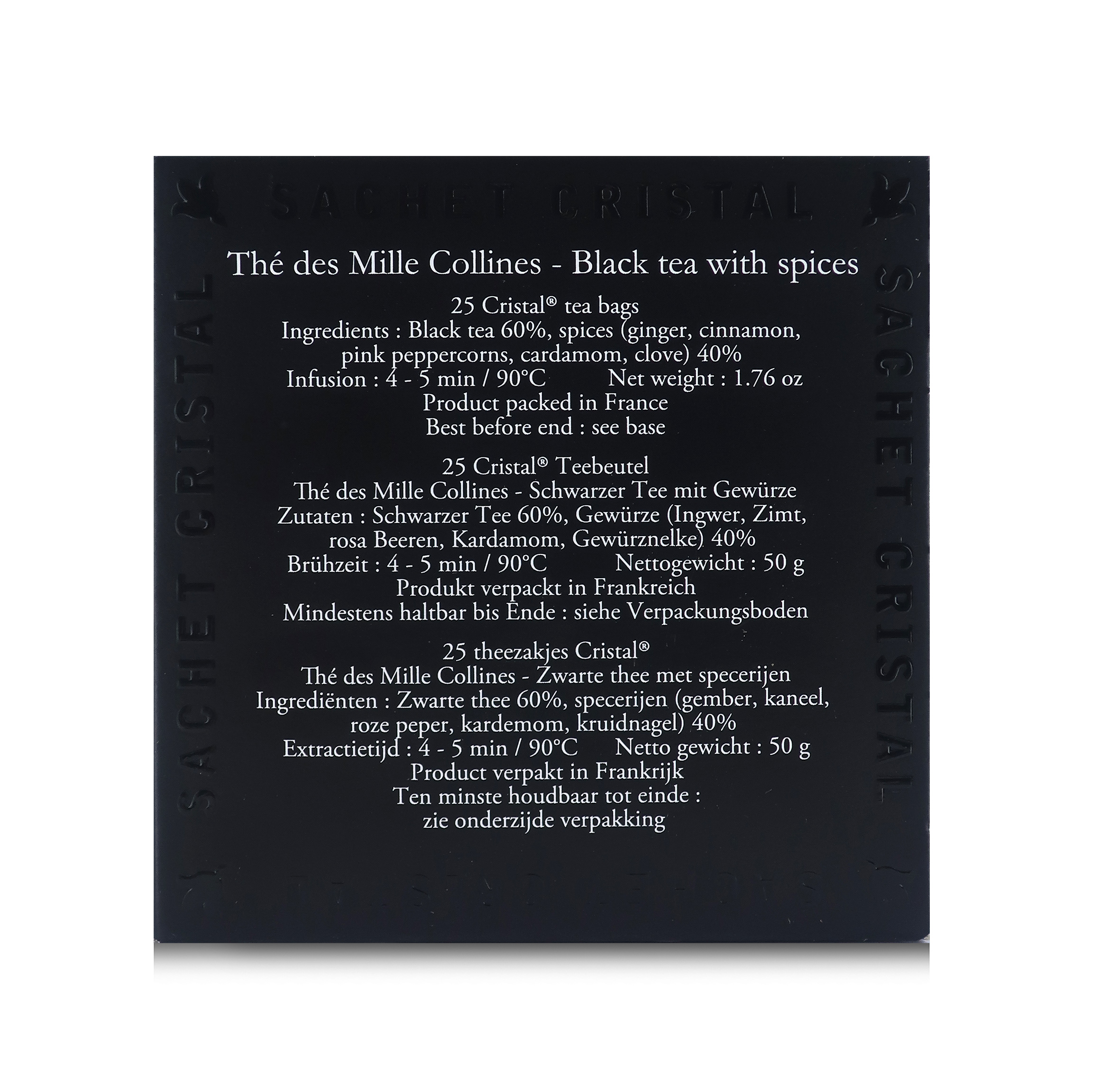Contrariamente al carattere placido dei paesaggi ruandesi, ricchi di dolci colline, i tè che vengono prodotti in queste zone vantano un gusto forte e corposo. La miscela "Thé des Mille Collines" non è certo un'eccezione, unendo la forza del tè nero ai profumi speziati di zenzero, cannella, cardamomo, pepe rosa e chiodi di garofano. Può essere preparato con acqua e gustato con una goccia di latte, oppure direttamente infuso in latte caldo.