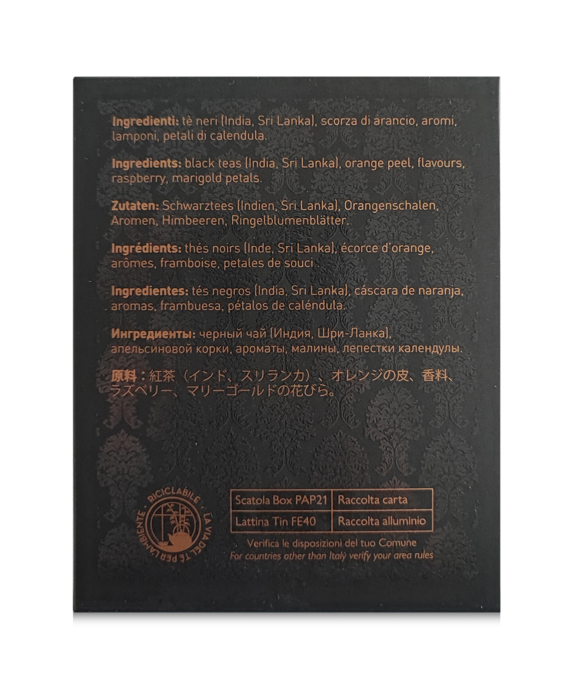 Ingredienti: tè neri, scorza di arancia, aromi, lamponi, calendula.