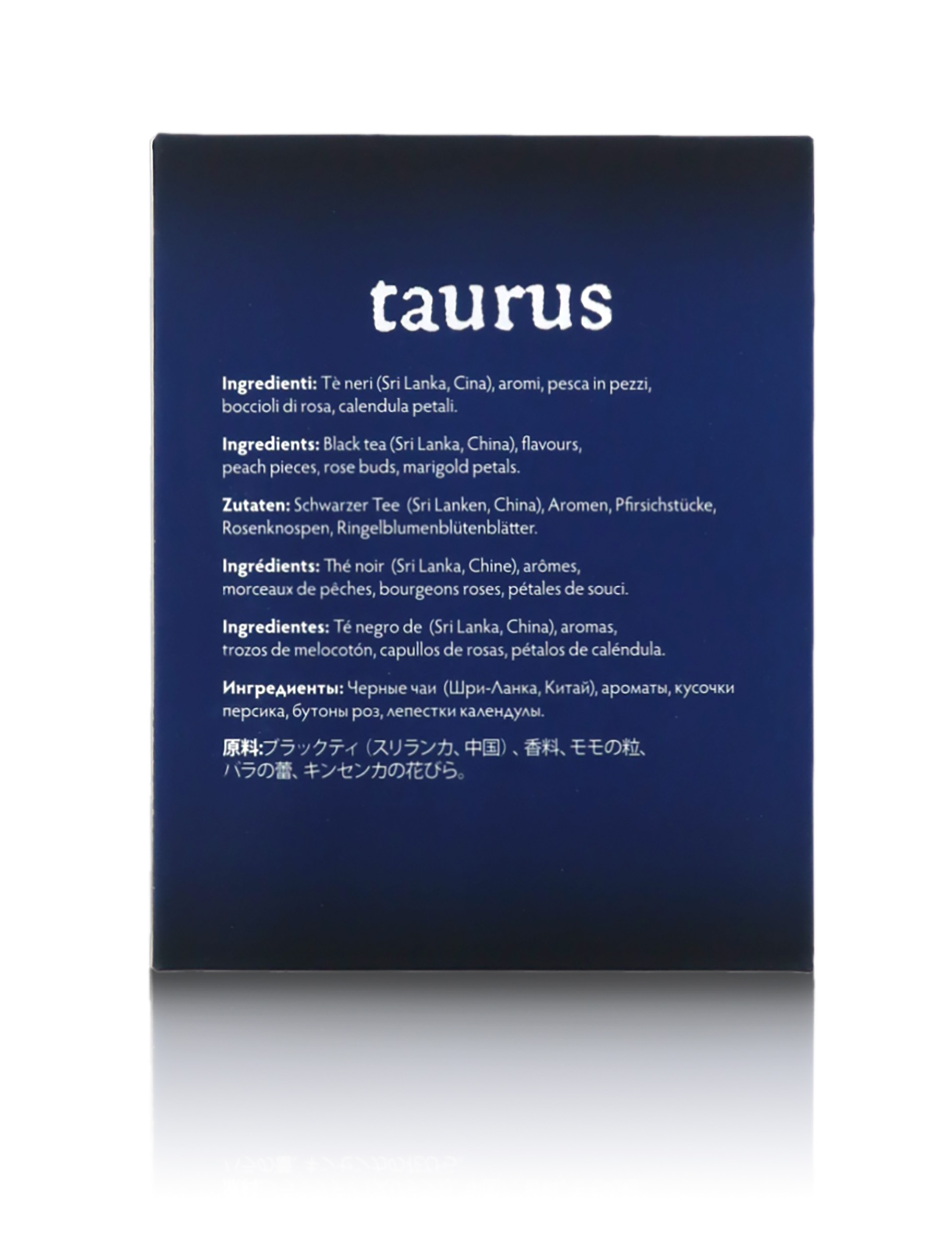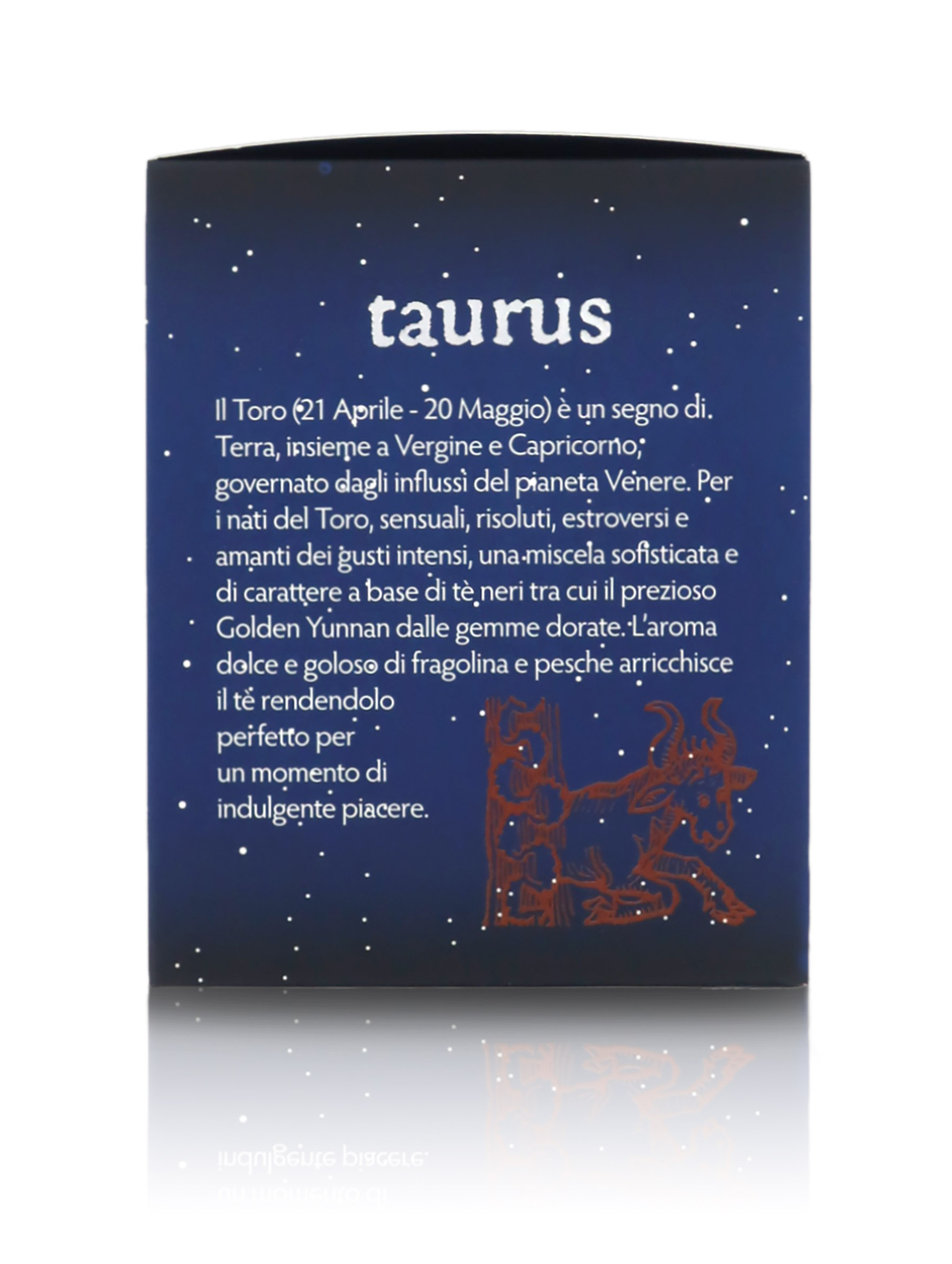 Miscela sfusa di tè neri, piacevolmente profumata, dedicata al segno del Toro. Il Toro (21 Aprile - 20 Maggio) è un segno di Terra, al pari della Vergine e del Capricorno. I Toro, governati dall'influsso del Pianeta Venere, risultano sensuali, estroversi e decisi. Per loro, La Via del Tè ha dato vita a un blend sofisticato e ricco di personalità, impiegando tè neri di Ceylon e cinesi. Tra questi, si annovera il pregiato Golden Yunnan, famoso per le sue punte (gemme) dorate. L'aroma dolce e fruttato di fragolina e pesca arricchisce questa miscela di tè.