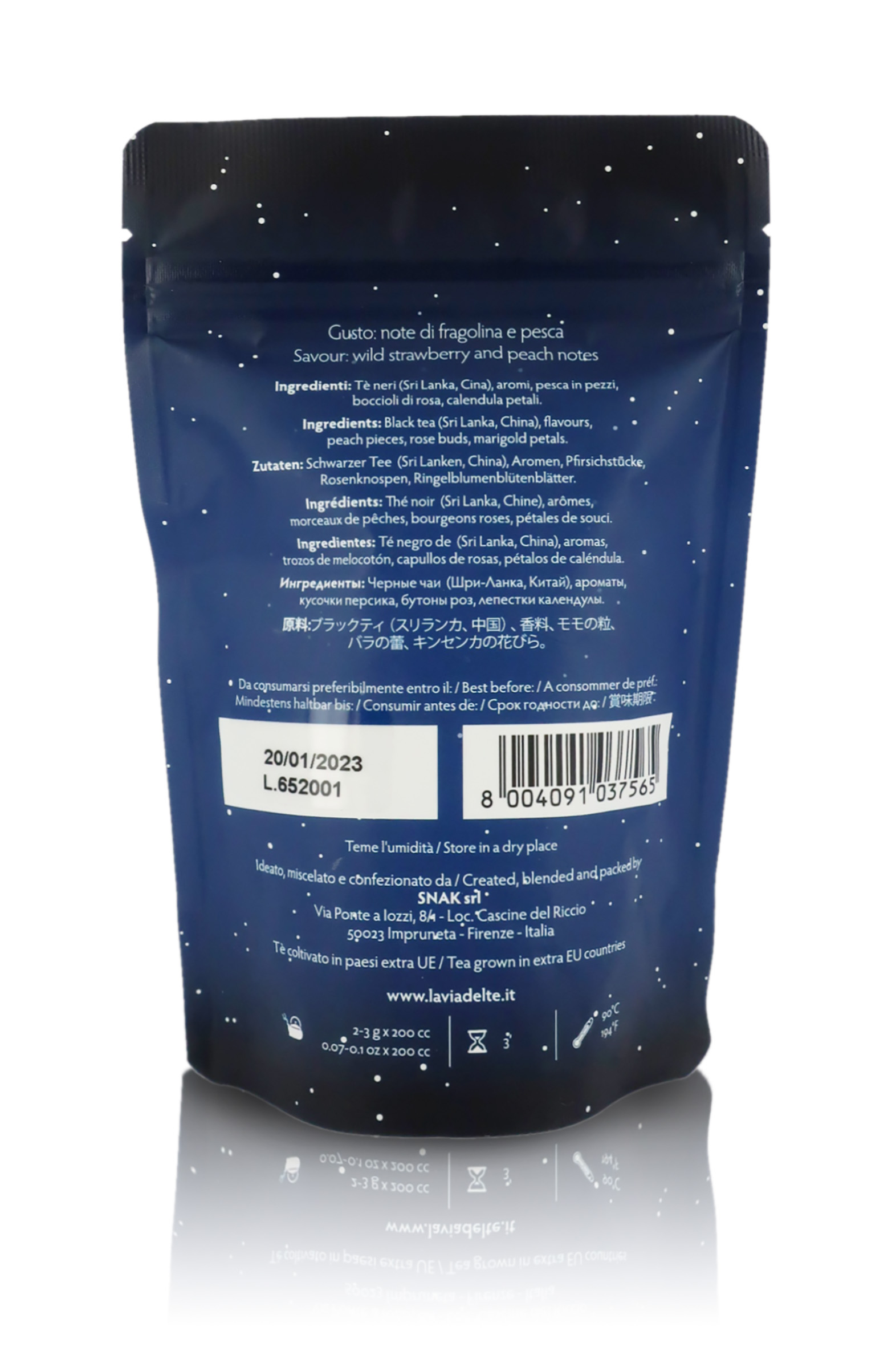 Ingredienti: Tè neri di Ceylon e Cina, aromi, pesca in pezzi, boccioli di rosa, petali di calendula.
