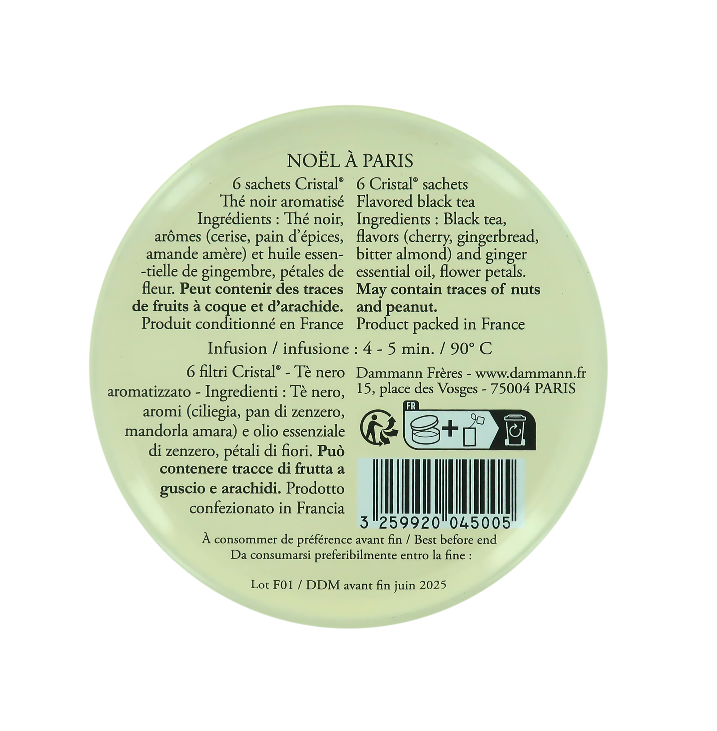 Tè natalizio "Noël à Paris" in mini confezioni regalo. Un astuccio in metallo prodotto in Francia, elegante e riutilizzabile come piccola scatolina, che contiene 6 filtri "Cristal" Dammann Freres. La scatoletta contiene 6 bustine "Cristal" di tè nero con aromi (ciliegia, pan di zenzero, mandorla amara), olio essenziale di zenzero e petali di fiori.