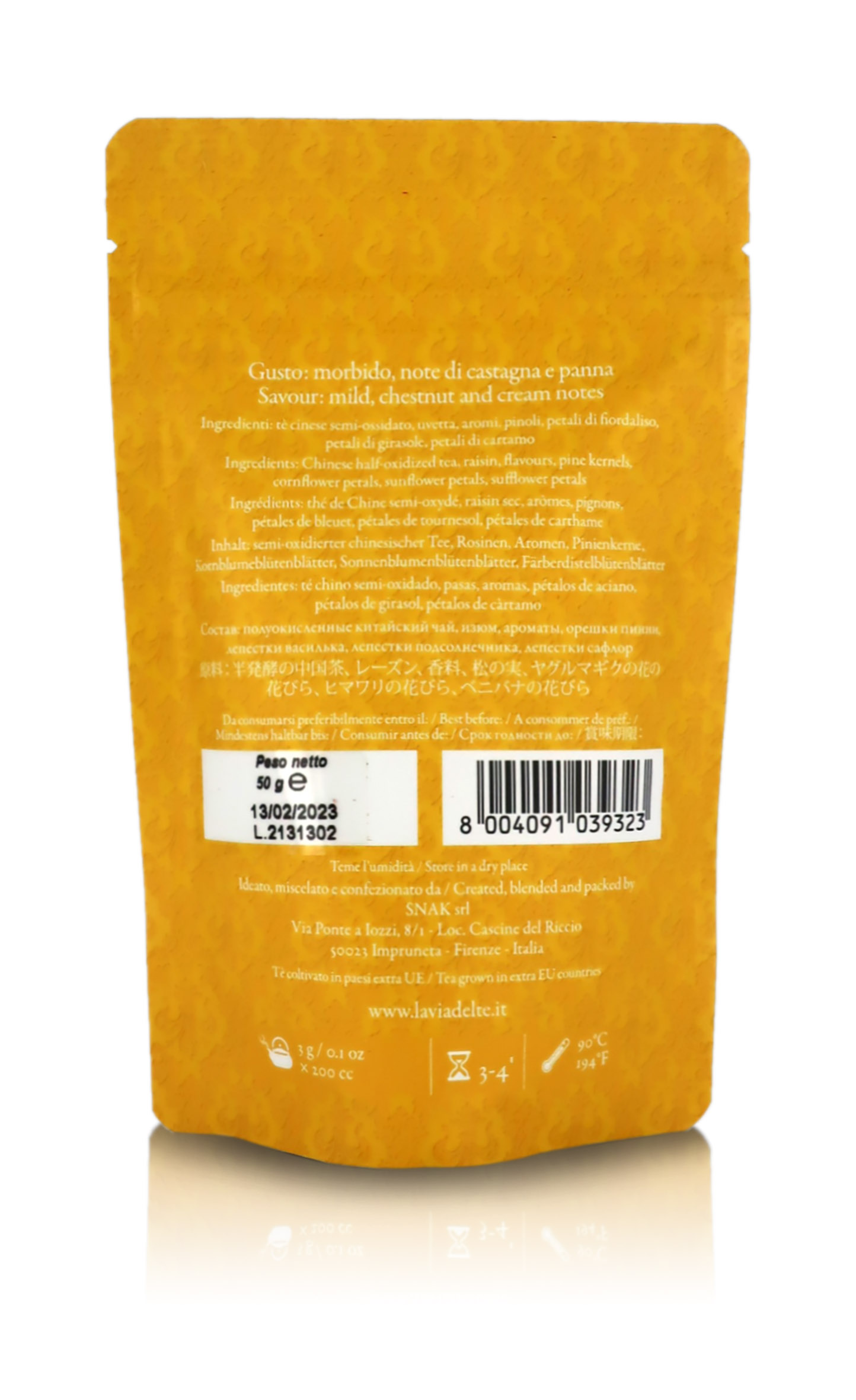 Ingredienti: Tè cinese Oolong, uvetta, aromi, pinoli, fiordaliso, petali di girasole, cartamo.