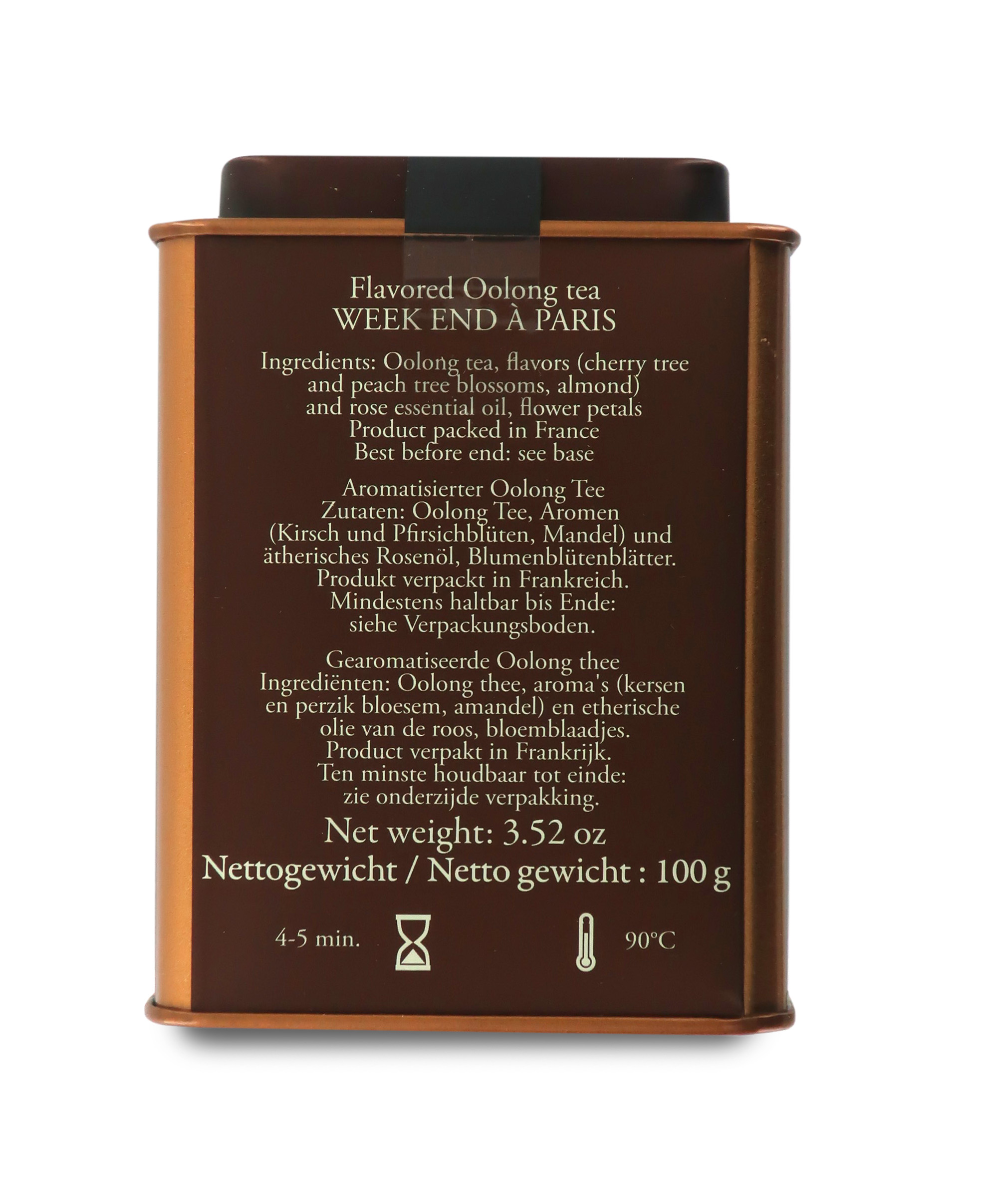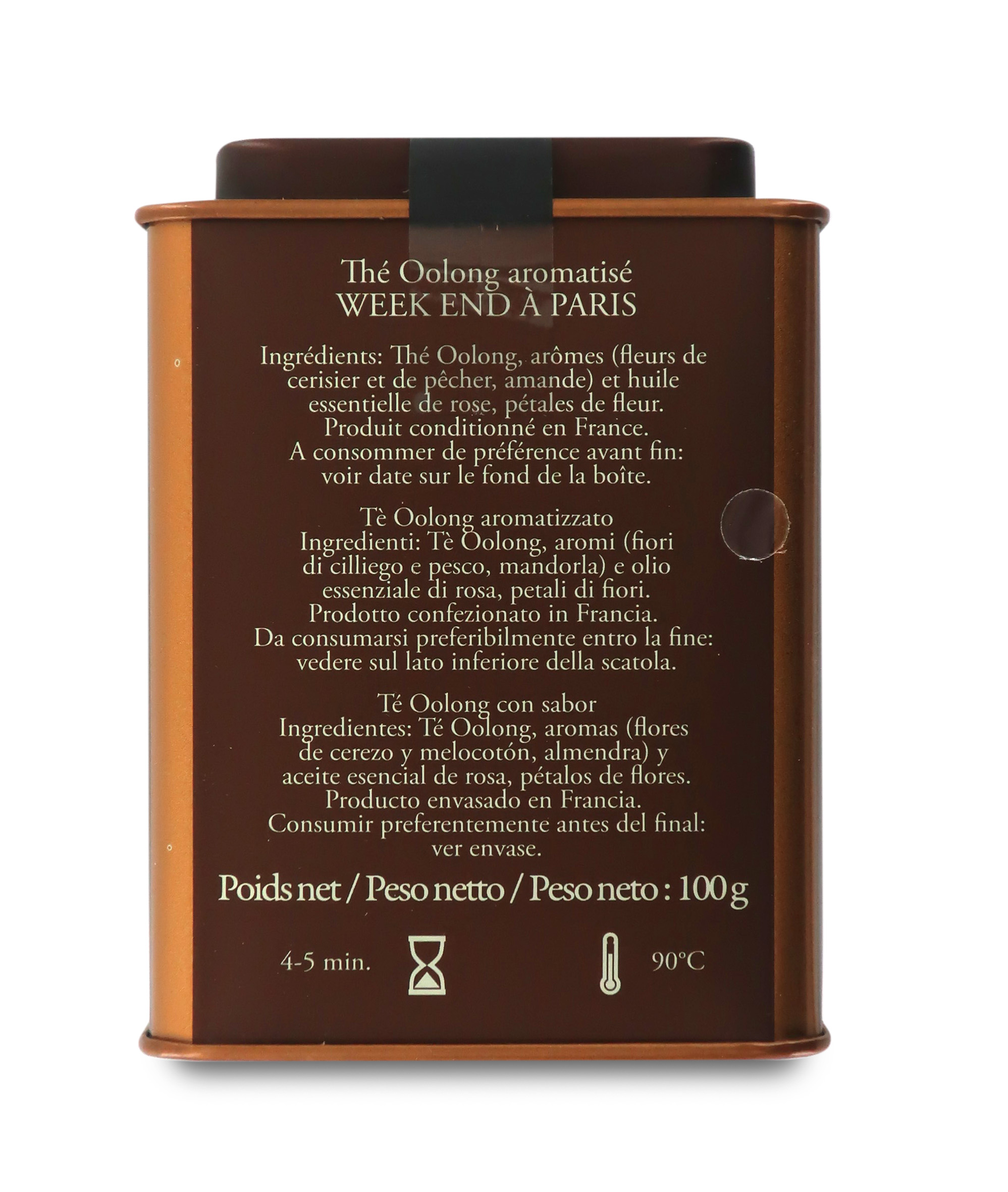 "Week-End à Paris" è un tè Oolong raffinato, dalle note fruttate e floreali, in cui si mescolano aromi di erbe, la dolcezza della mandorla e la delicatezza dei fiori di ciliegio, di pesco e della rosa. Il bouquet spicca per la nota principale del fior di ciliegio e i gusti di fondo della mandorla e della rosa.