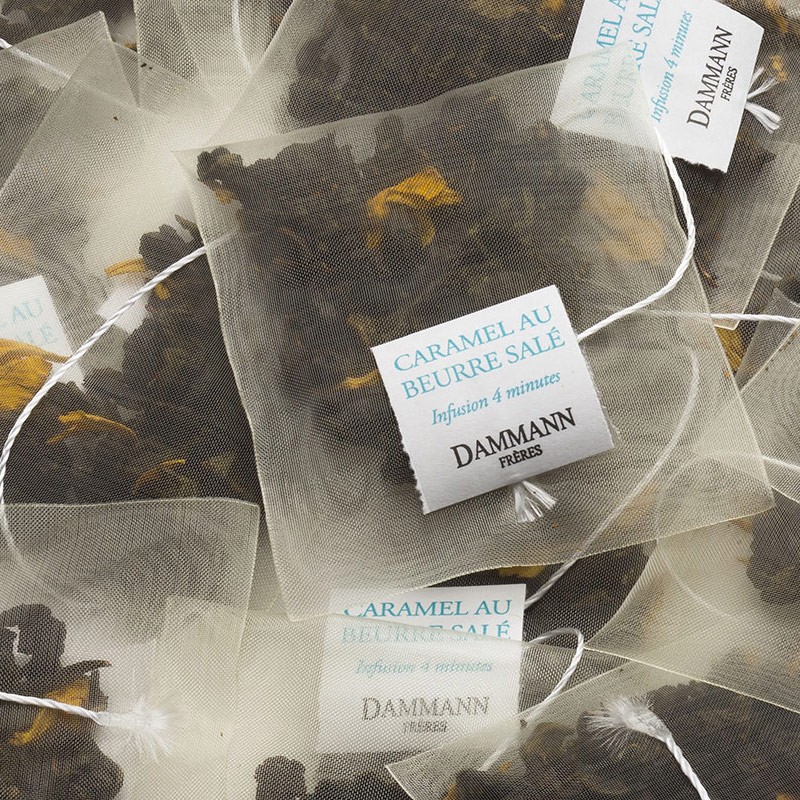 Il tè "Caramel au Beurre Salé" di Dammann Frères è contenuto in esclusive e pratiche bustine "Cristal" incartate singolarmente.