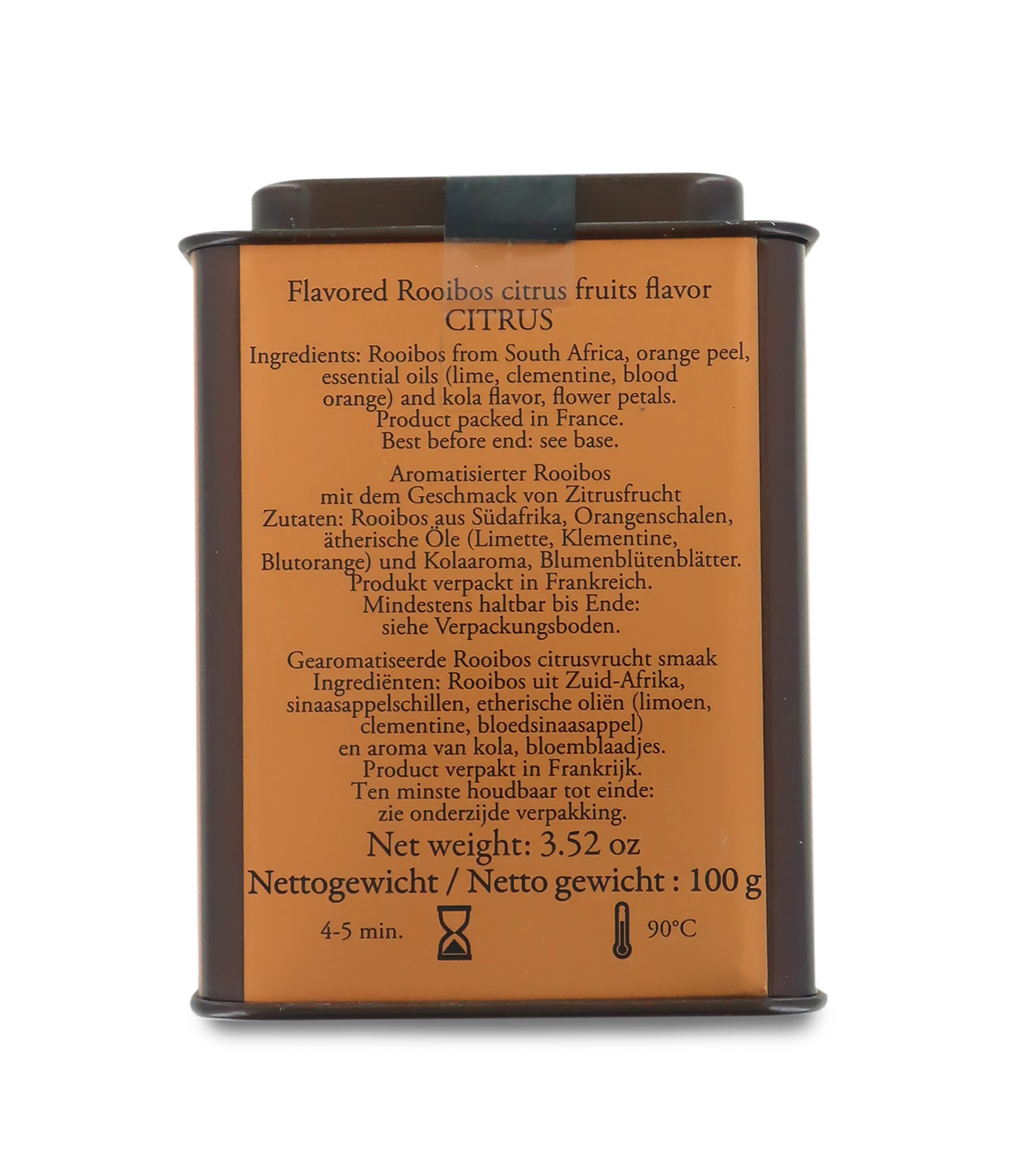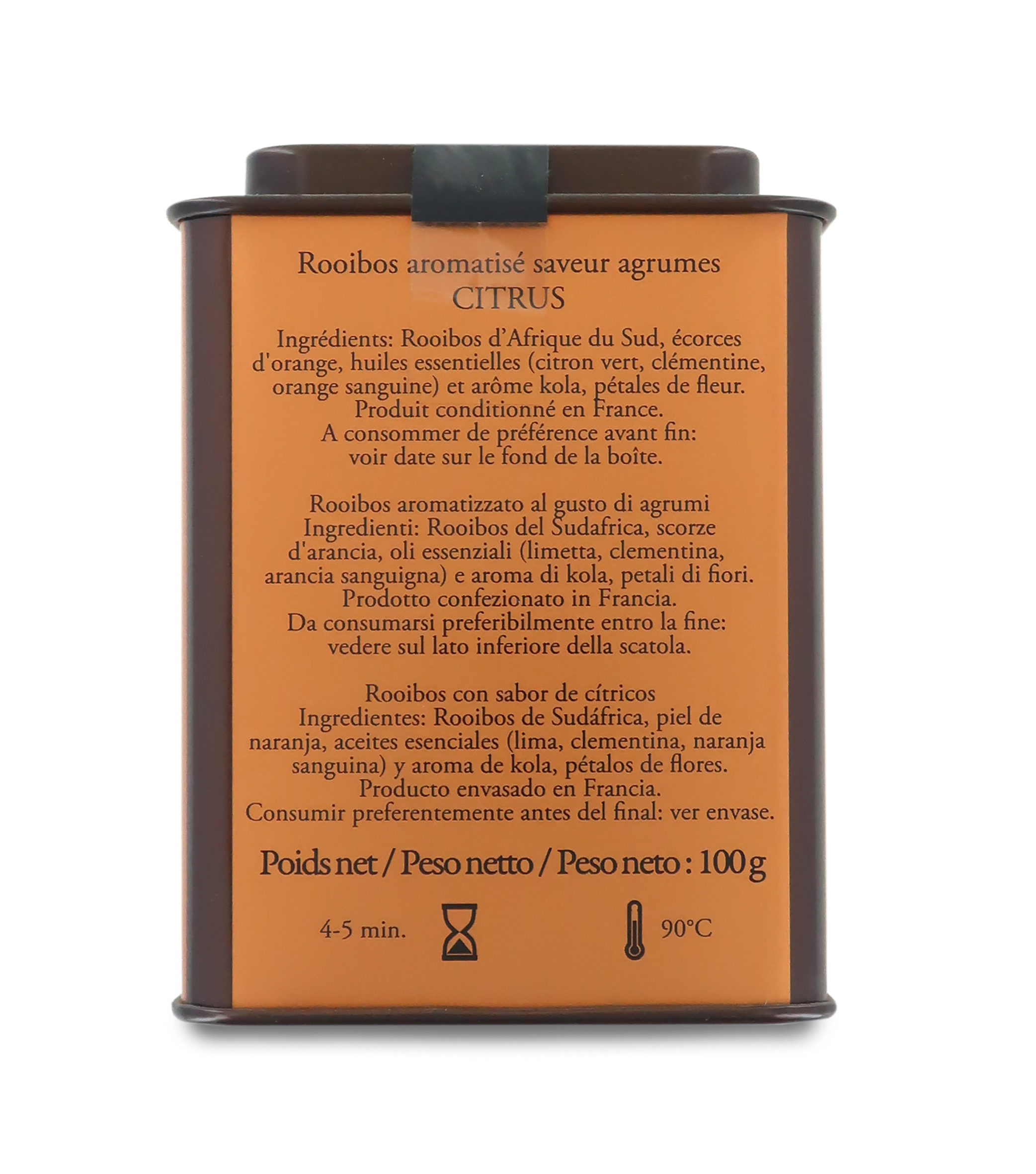 Questo rooibos agli agrumi di Dammann Frères è contenuto in un'elegantissima scatola di latta, perfetta non solo per conservare il prezioso aroma di questa miscela pregiata, ma anche da regalare.