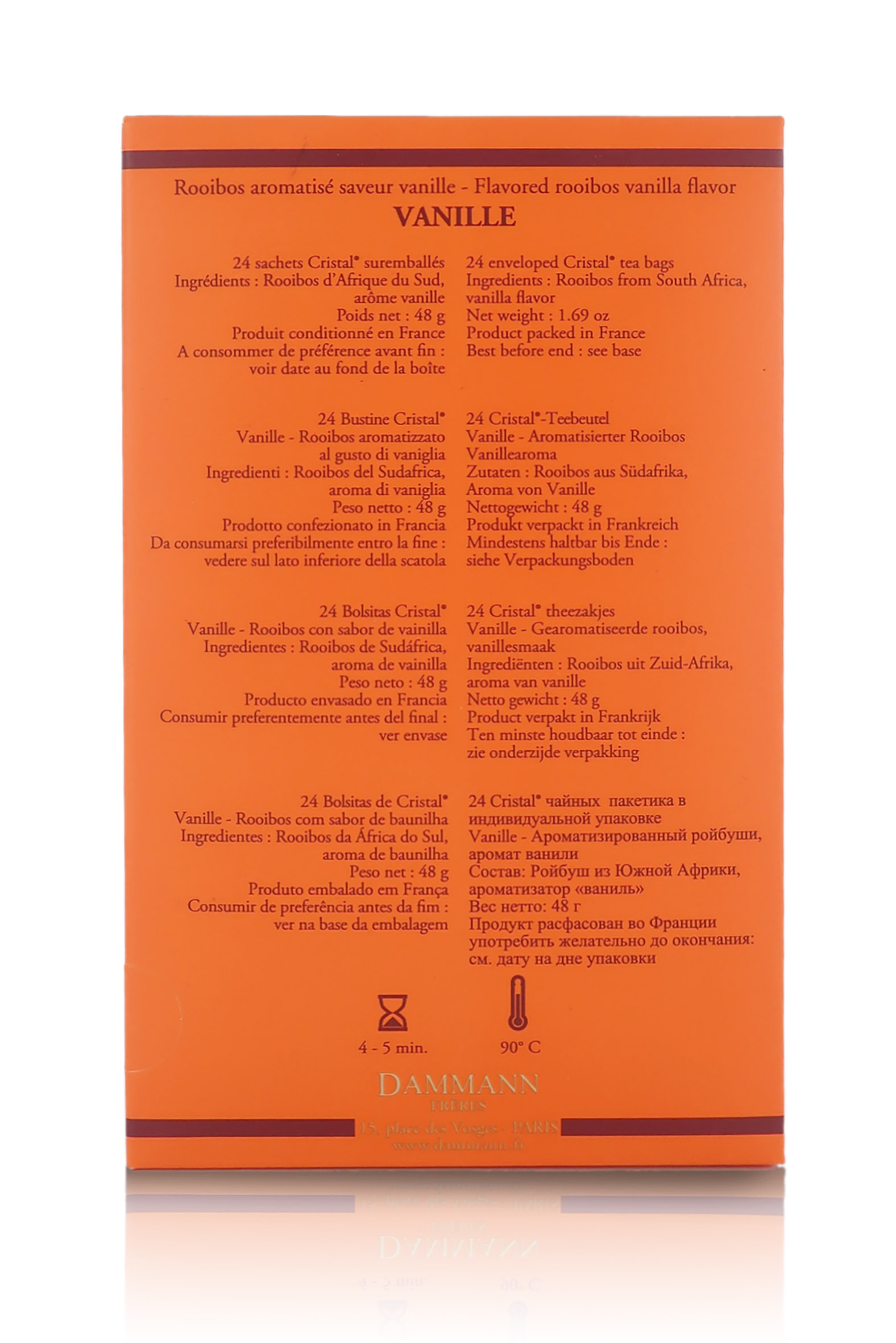 Questo rooibos alla vaniglia di Dammann Frères è contenuto in esclusive e pratiche bustine "Cristal" incartate singolarmente.