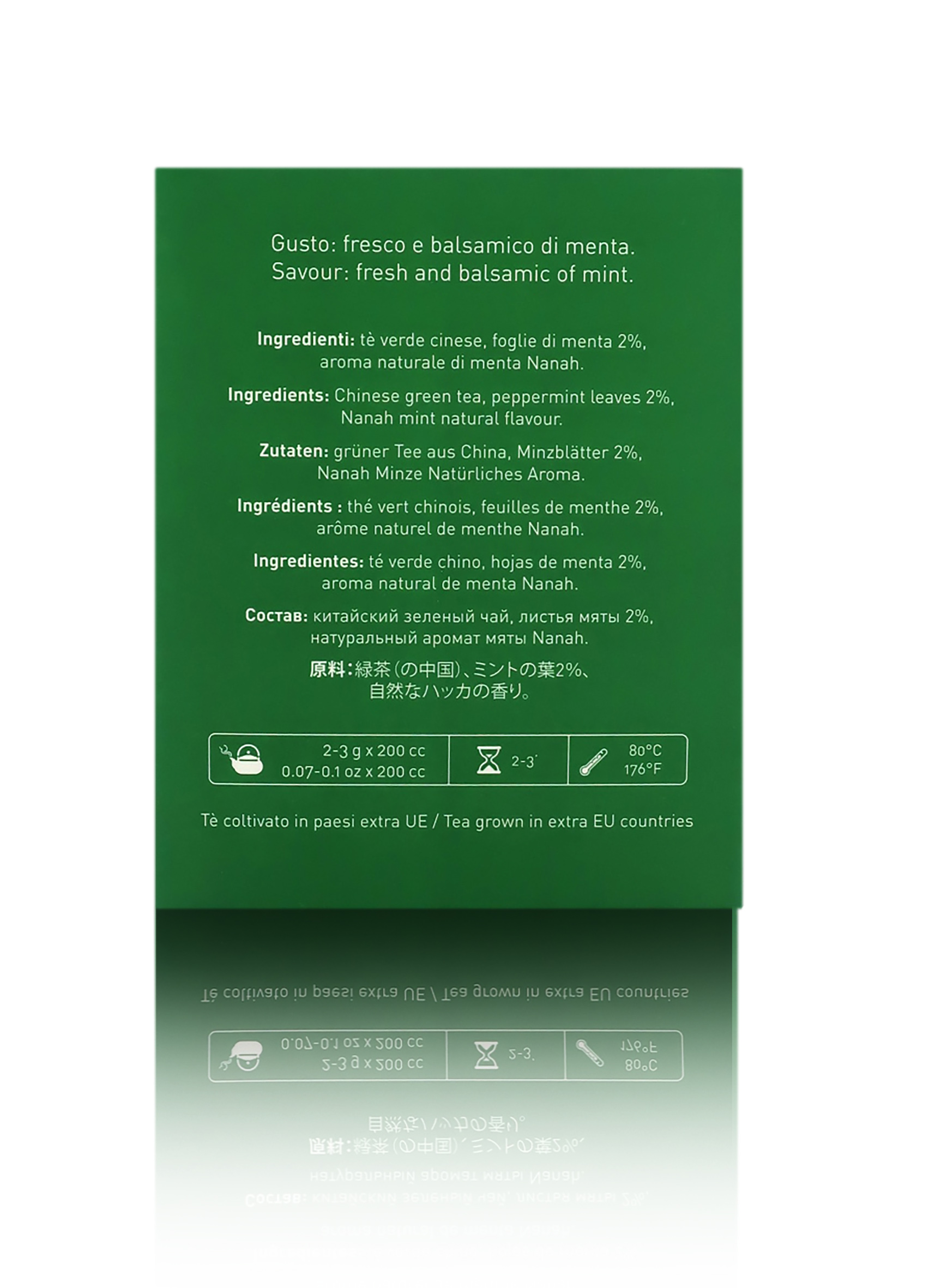 Ingredienti: tè verde cinese Special Gunpowder, menta Viridis in foglie 2%, aroma naturale di menta Nanah 1%.