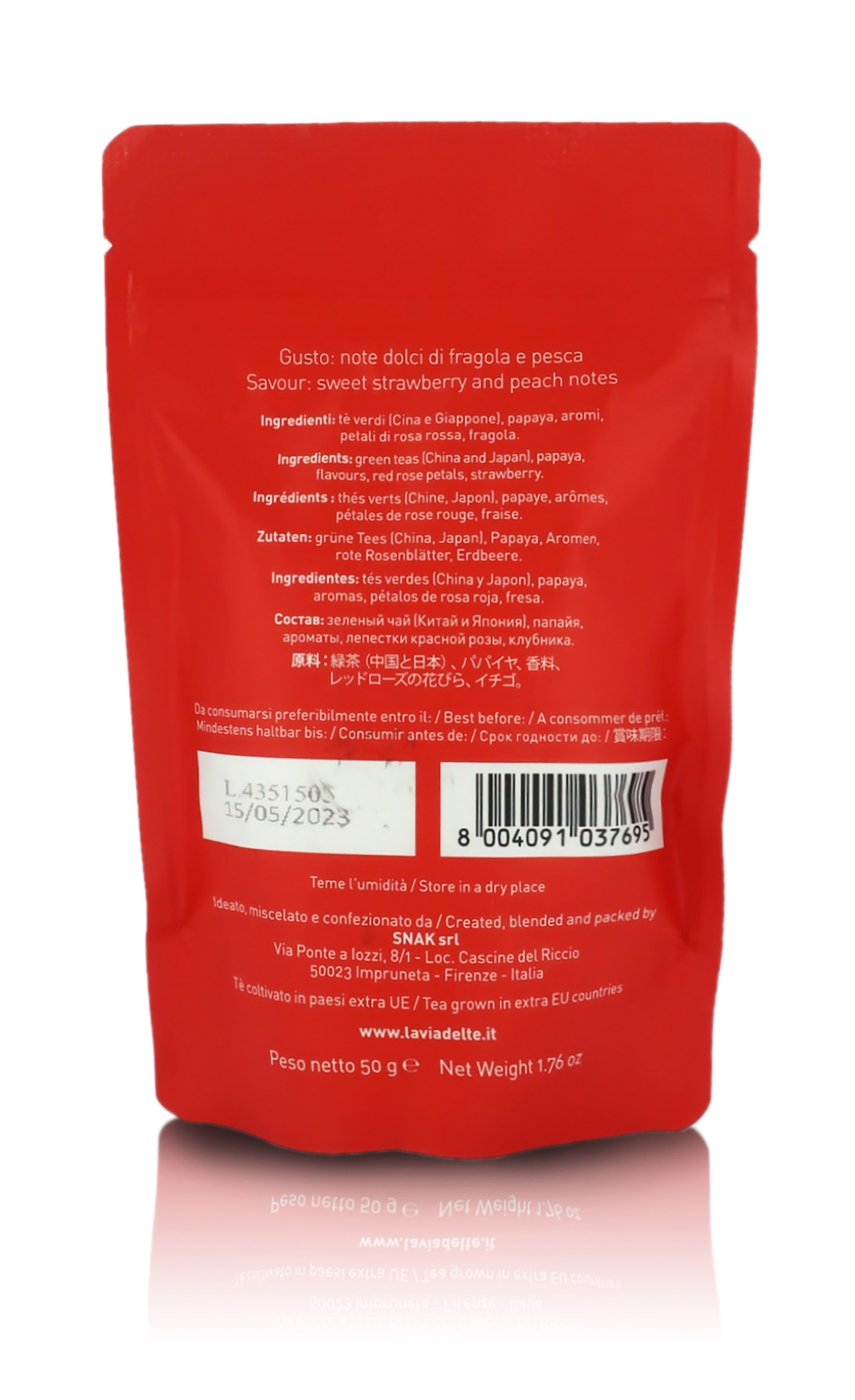 Ingredienti: Tè verdi, papaia, petali di rosa, fragola, aromi, aroma naturale.
