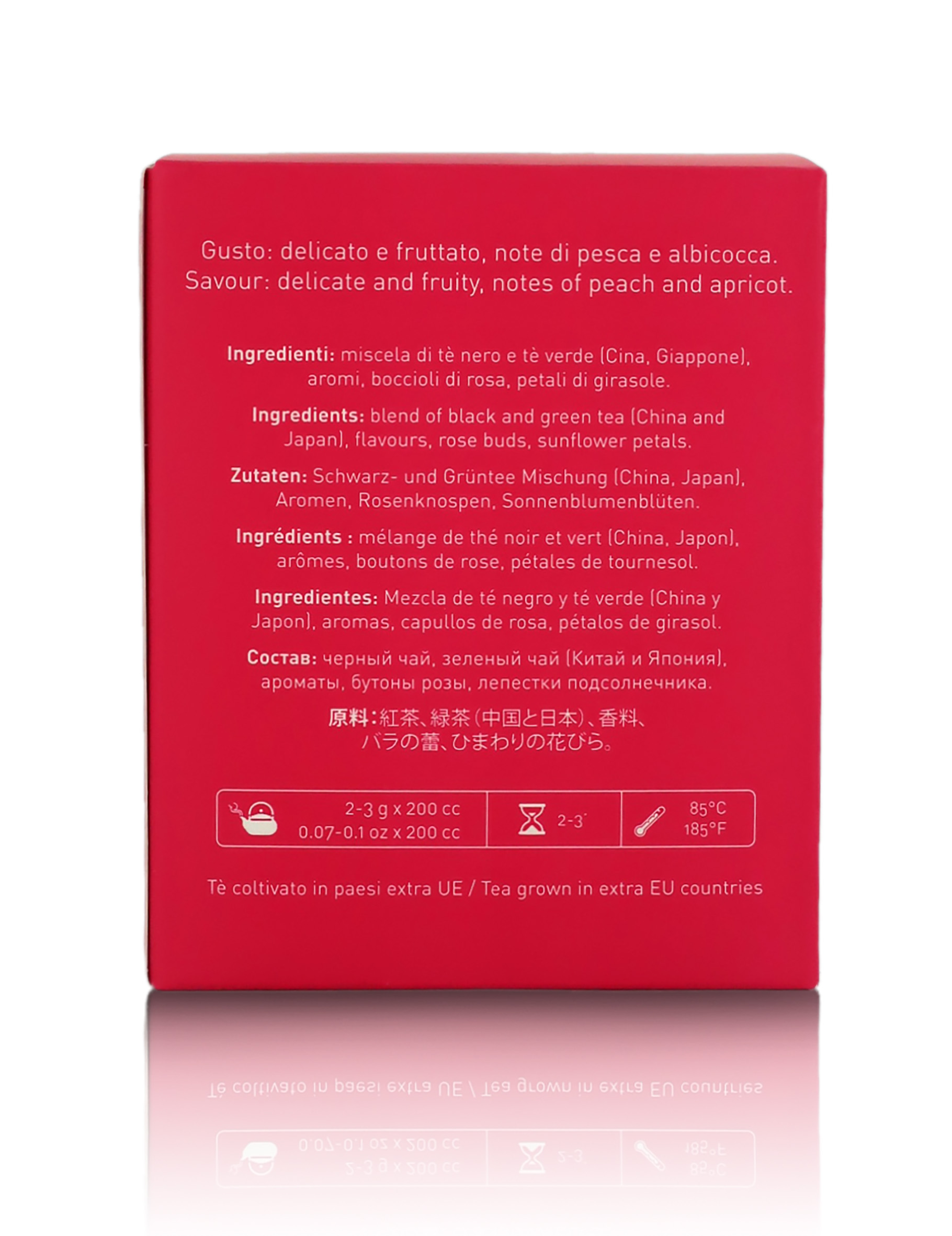 Una miscela soave di tè verde Bancha e tè alla rosa cinese, arricchita di petali di girasole e aromi fruttati, in cui regna l'equilibrato connubio tra frutta e fiori.