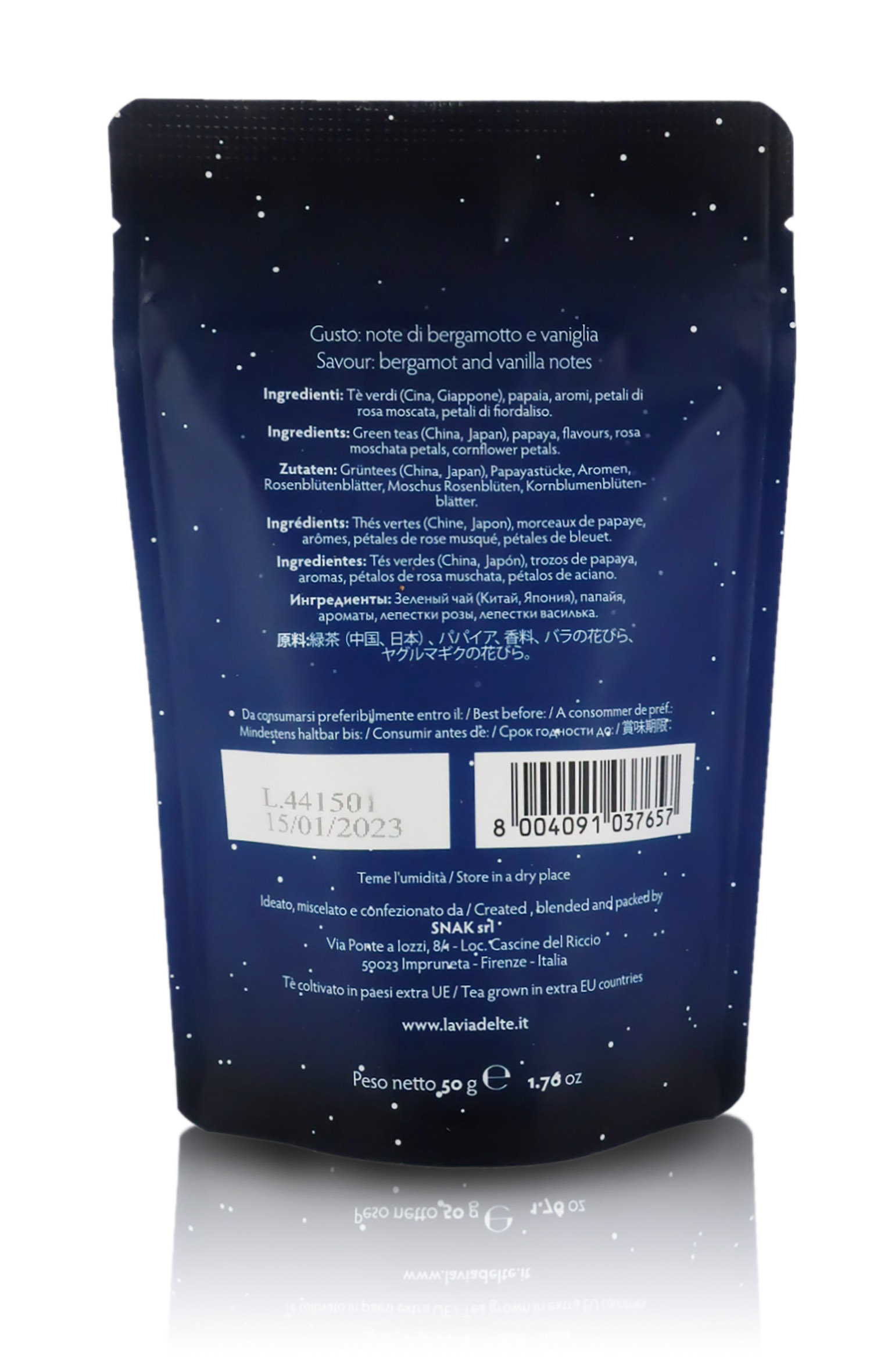 Ingredienti: Tè verdi cinesi, tè verdi giapponesi, papaia, aromi, petali di rosa moscata, petali di fiordaliso.