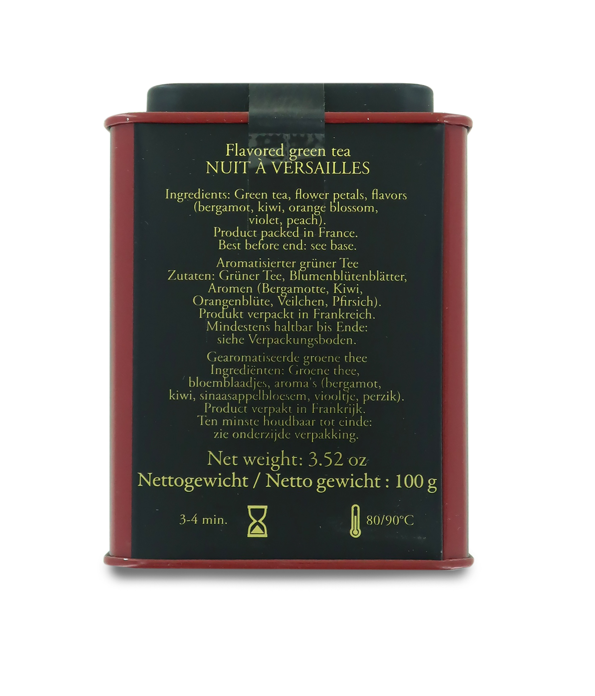 Il tè verde "Nuit à Versailles" celebra le note fruttate e floreali che abitano i lussureggianti giardini della reggia di Versailles: aromi di bergamotto, kiwi, pesca gialla, fiori d'arancio e di viola impreziosiscono una base di tè verde Sencha della Cina, dando vita a una miscela dal sapore nobile.