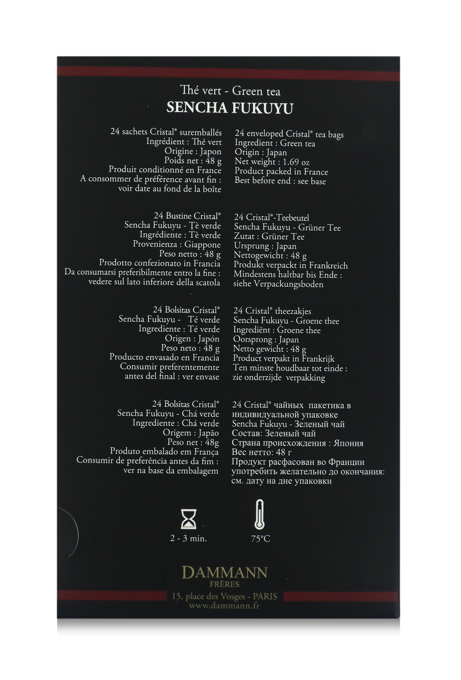 In Giappone, il tè verde Sencha fa parte della tradizione ed è comunemente chiamato "tè dell'ospitalità". Ricco di vitamina C, il tè Sencha (reso in forma di ago appiattito dopo un breve trattamento a vapore) è molto apprezzato in Giappone per il suo sapore rinfrescante. Il tè verde Sencha Fukuyu vi farà ottenere una tazza di bevanda dalle spiccate note vegetali, sentori di frutta e una leggera amarezza. Tempo di infusione: 2-3 min. È contenuto in esclusive e pratiche bustine "Cristal" incartate singolarmente.
