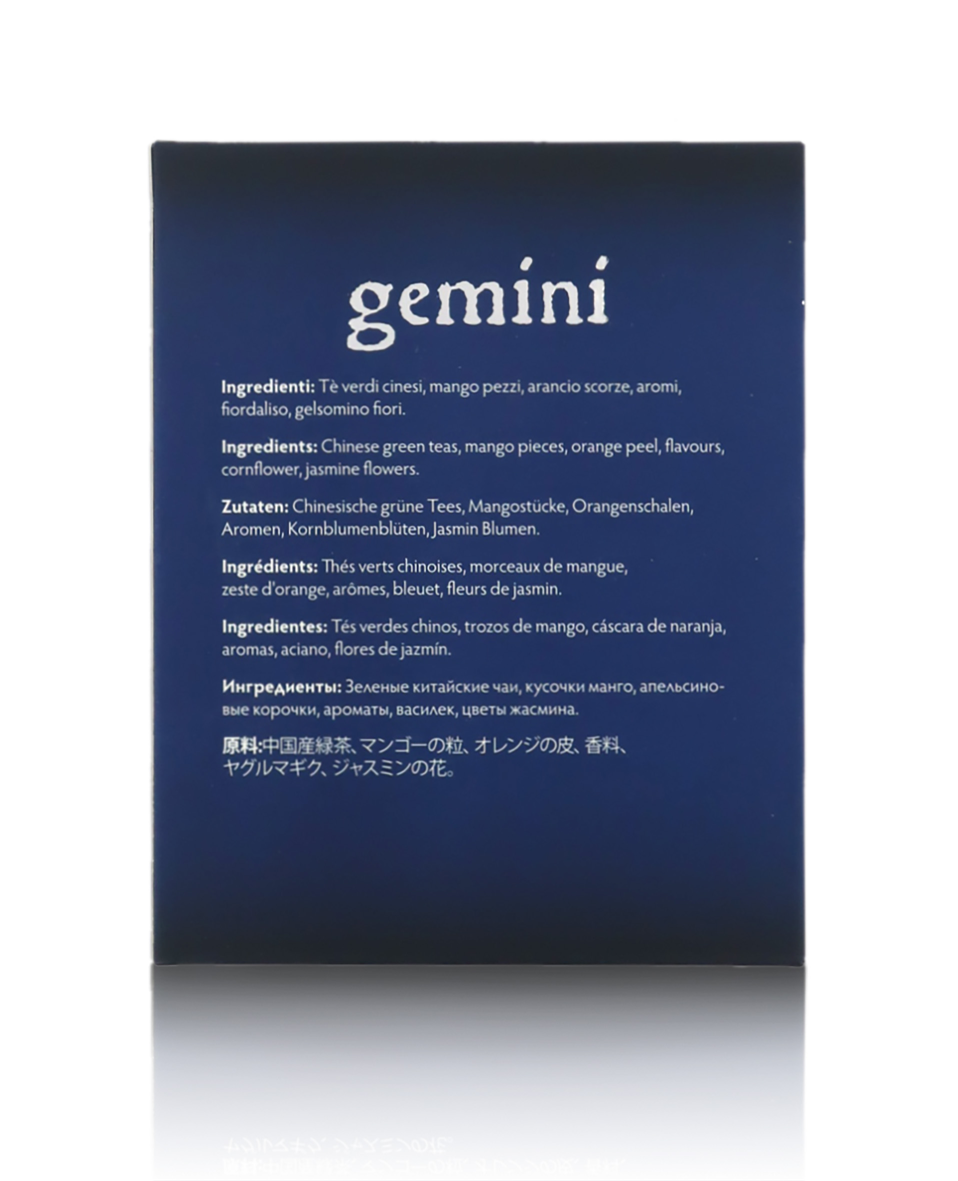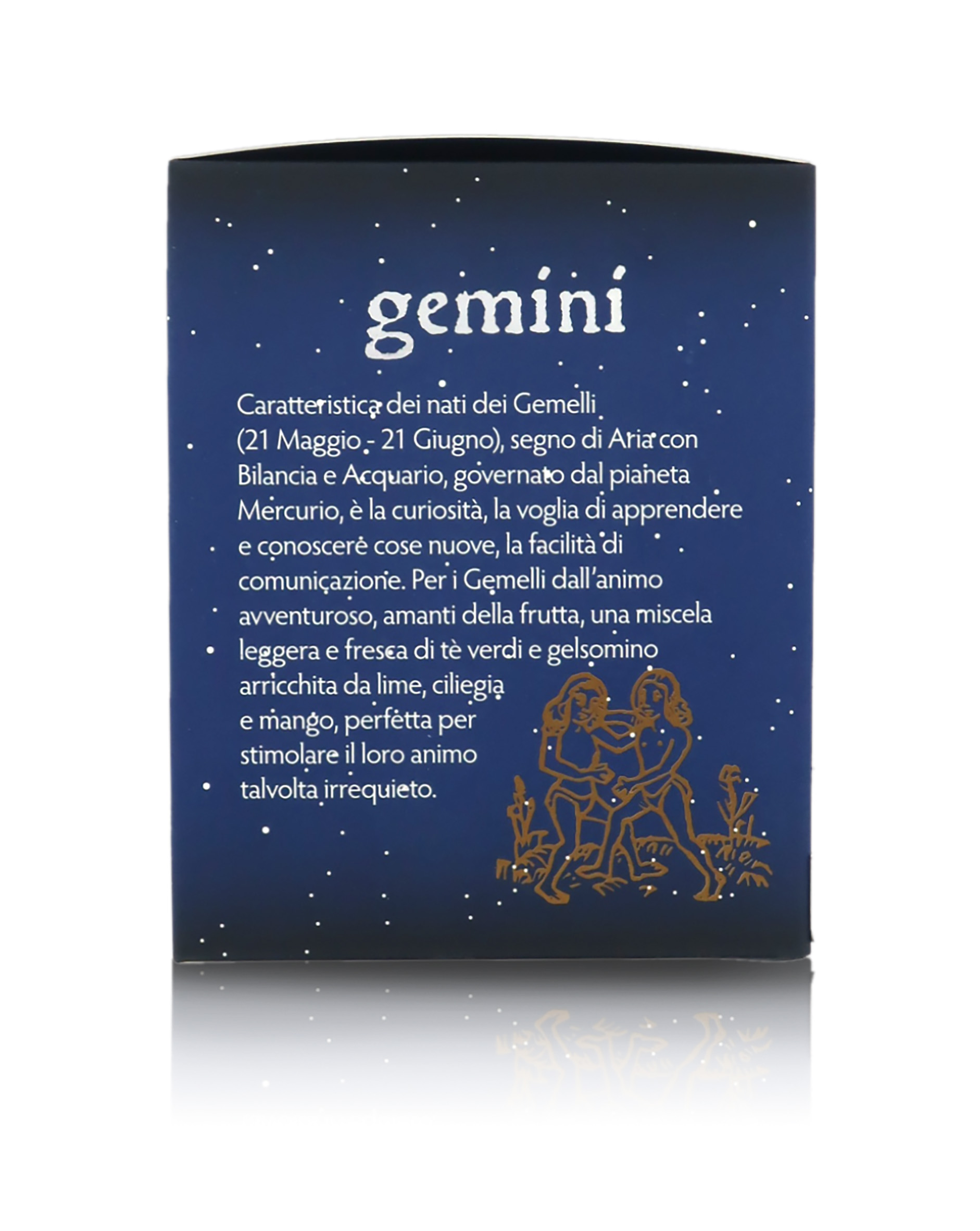 Miscela sfusa di tè verdi, piacevolmente profumata, dedicata al segno dei Gemelli. Segno di aria (come la Bilancia e l'Acquario), i nati sotto il segno dei Gemelli (21 Maggio - 21 Giugno) sono governati dagli influssi del pianeta Mercurio e si distinguono per curiosità e spinta verso la conoscenza del nuovo. La Via del Tè dedica ai Gemelli una miscela leggera e fresca realizzata con tè verdi e gelsomino, piacevolmente arricchita da lime, ciliegia e mango. Vanta un aroma soave fruttato e floreale, un colore giallo scuro tendente al dorato e un gusto equilibrato e leggero, in cui spicca una leggera nota erbacea tipica del tè verde.