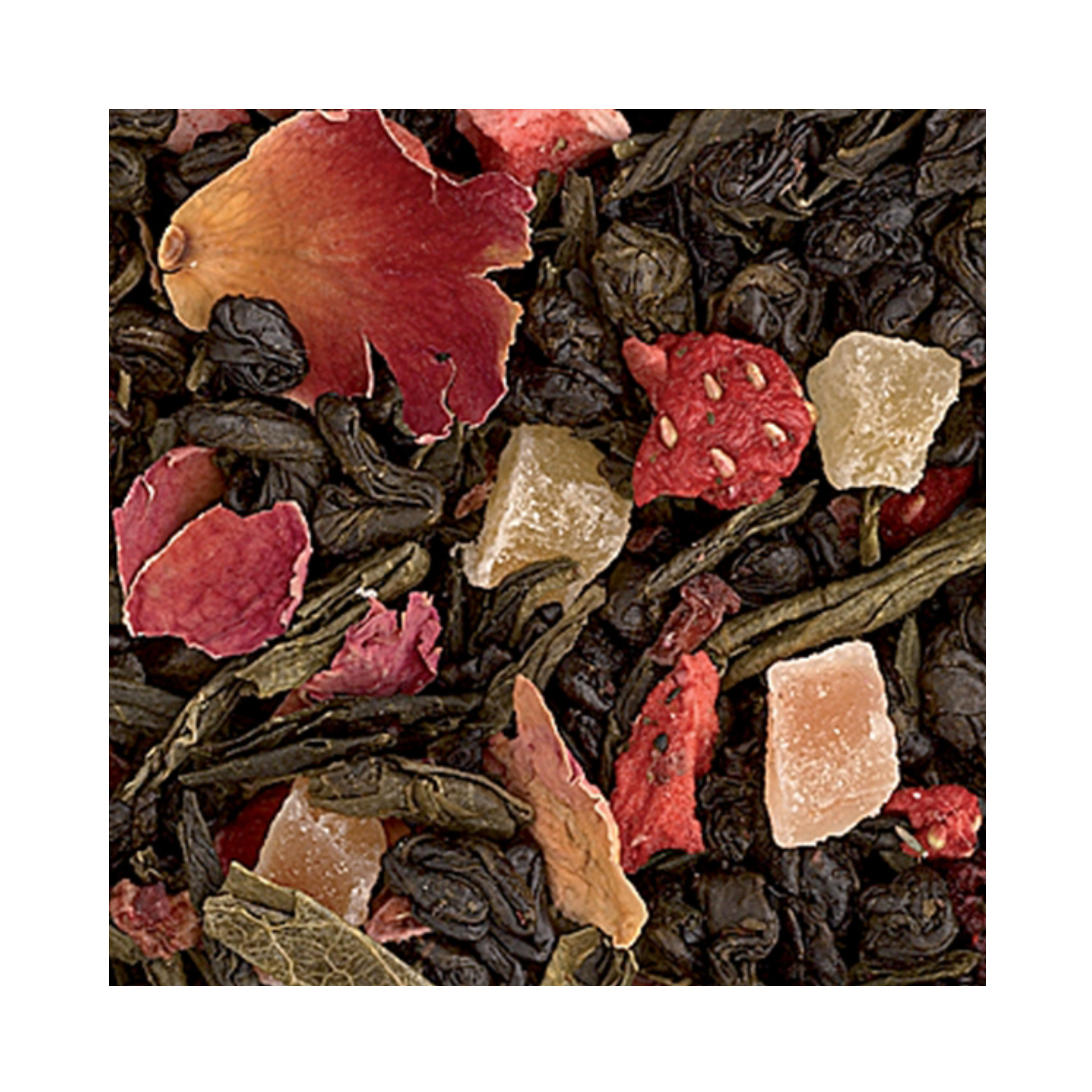 Miscela romantica di tè verdi in foglia, con petali di rosa e pezzetti di frutta (fragola e papaia). Vanta un profumo intenso e un gusto dolce e fruttato.