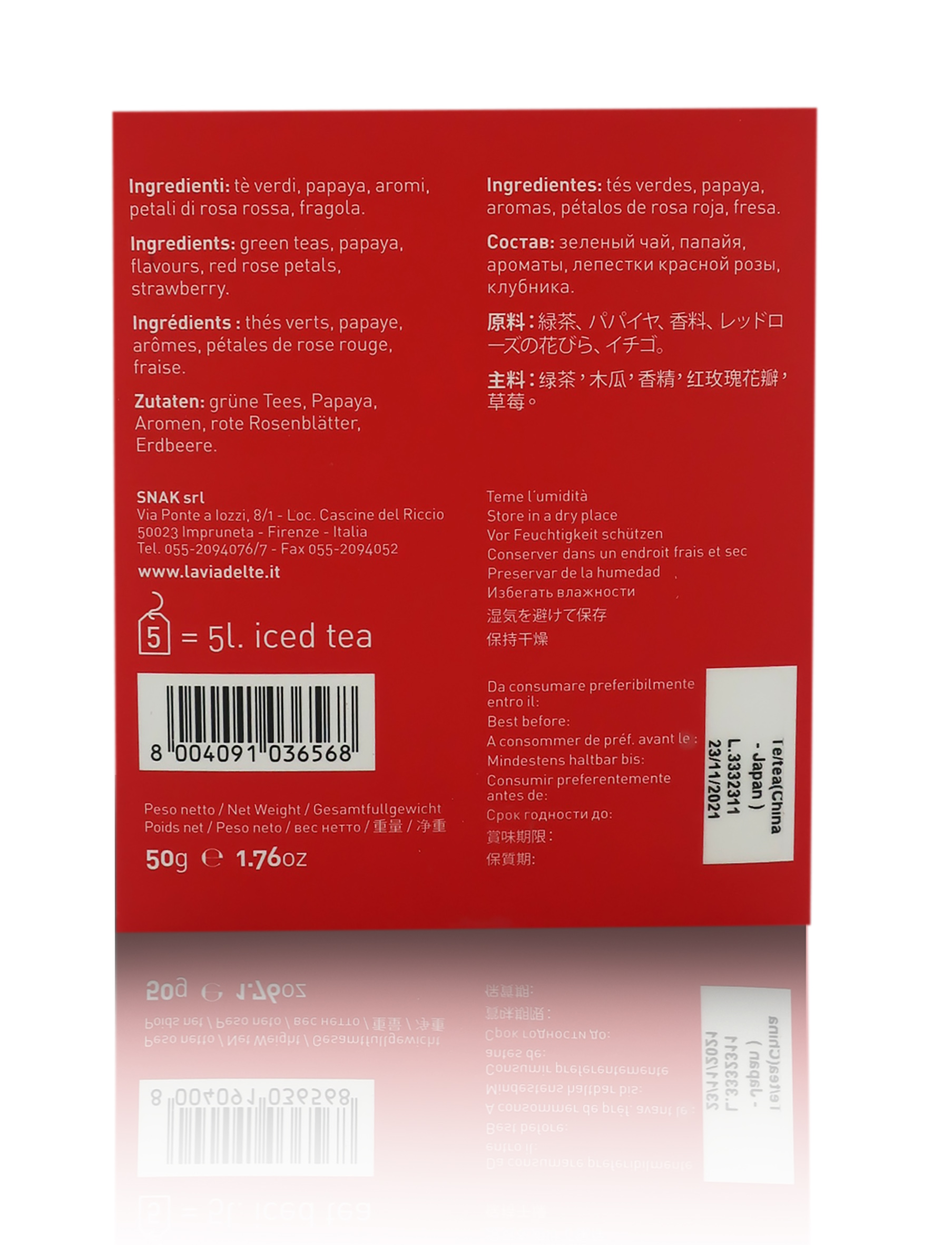 Ingredienti: Tè verdi, papaia, aromi, petali di rosa rossa, fragola.
