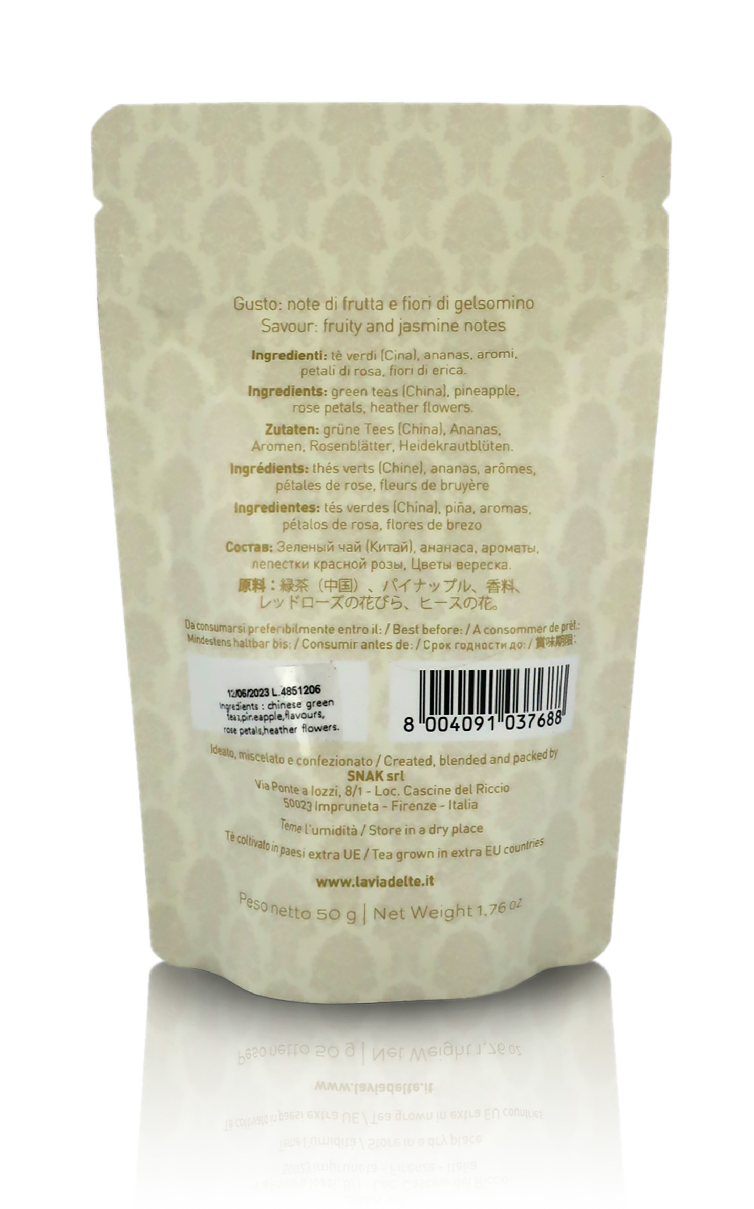 Ingredienti: tè verdi, ananas, aromi, petali di rosa, fiori di erica.