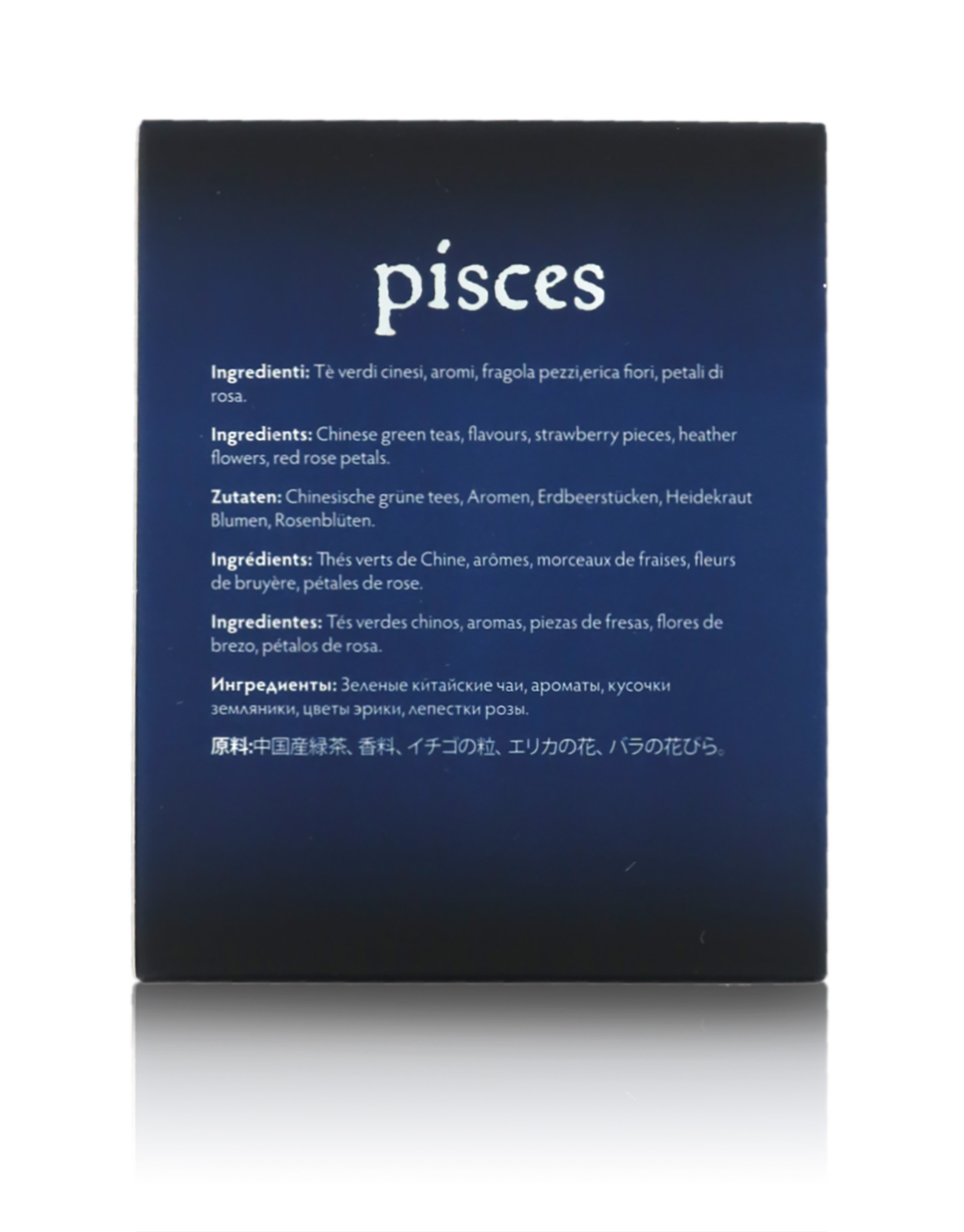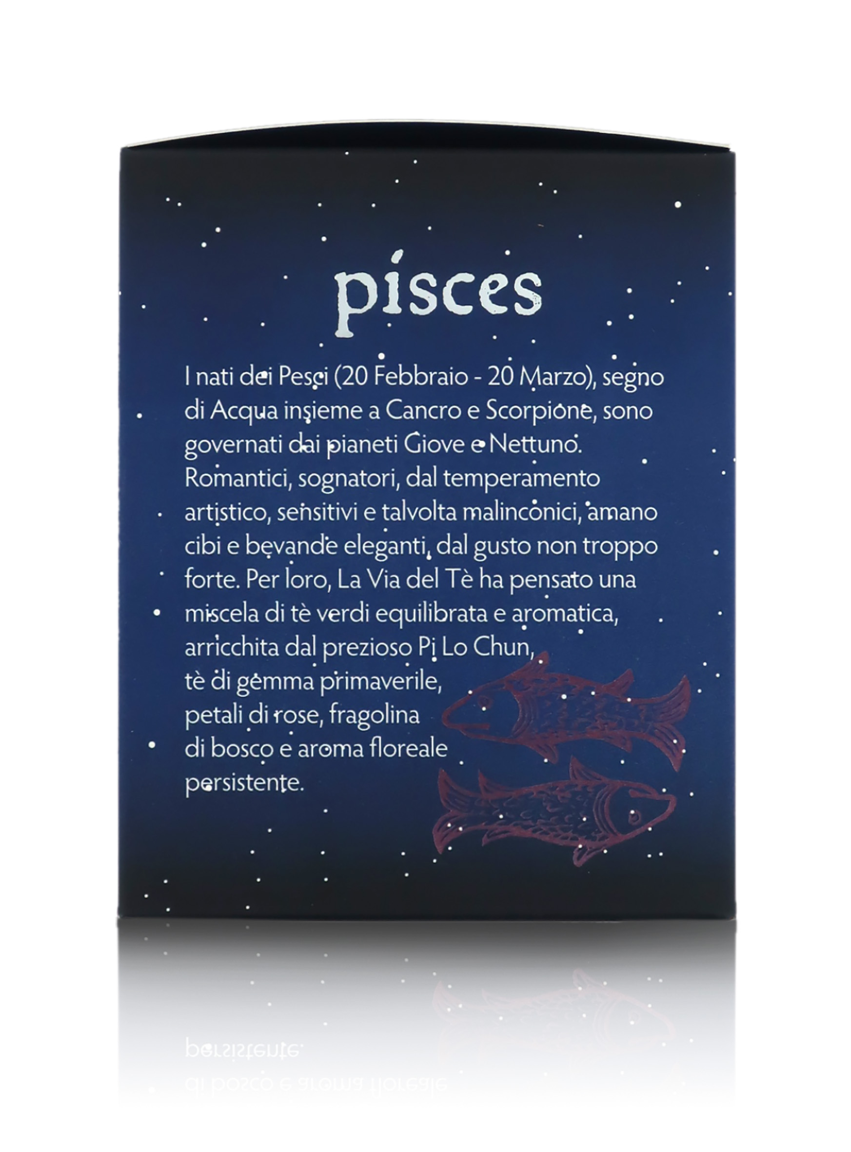 Miscela sfusa di tè verdi cinesi, piacevolmente profumata, dedicata al segno dei Pesci (segno d'acqua, come il Cancro e lo Scorpione). I nati sotto il segno dei Pesci (20 Febbraio - 20 Marzo), governati dagli influssi dei pianeti Giove e Nettuno, si distinguono per la loro propensione a sognare. Sono inclini all'arte, al romanticismo e alla sensibilità.