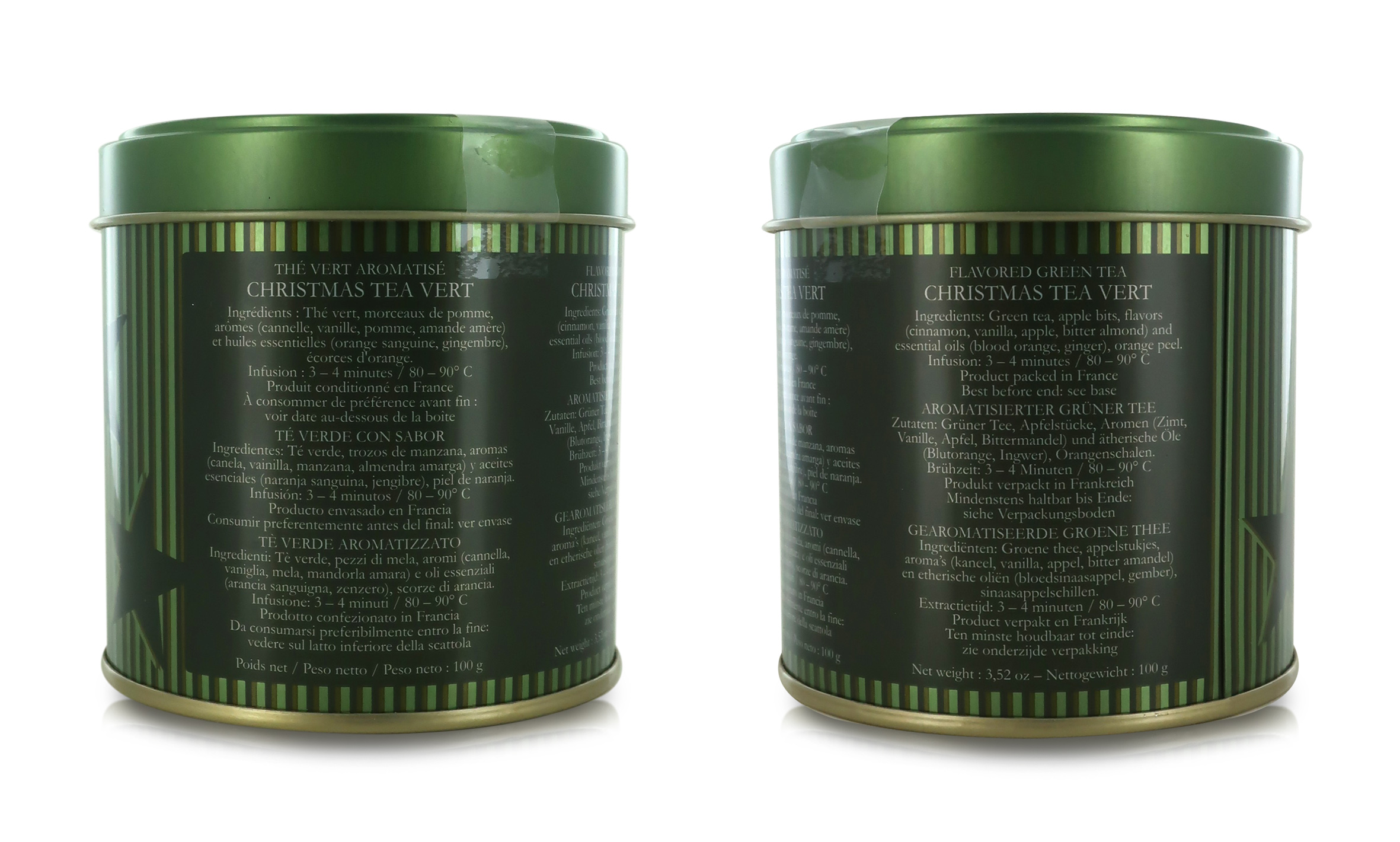 Tè natalizio con pezzi di mela, aromi (cannella, vaniglia, mela, mandorla amara) e oli essenziali (arancia rossa, zenzero), scorza d'arancia. Un tè verde natalizio molto fruttato, che renderà i vostri pomeriggi delle feste di Natale ancora più speciali! Grazie alla confezione molto natalizia, rappresenta un ottimo regalo per le feste.