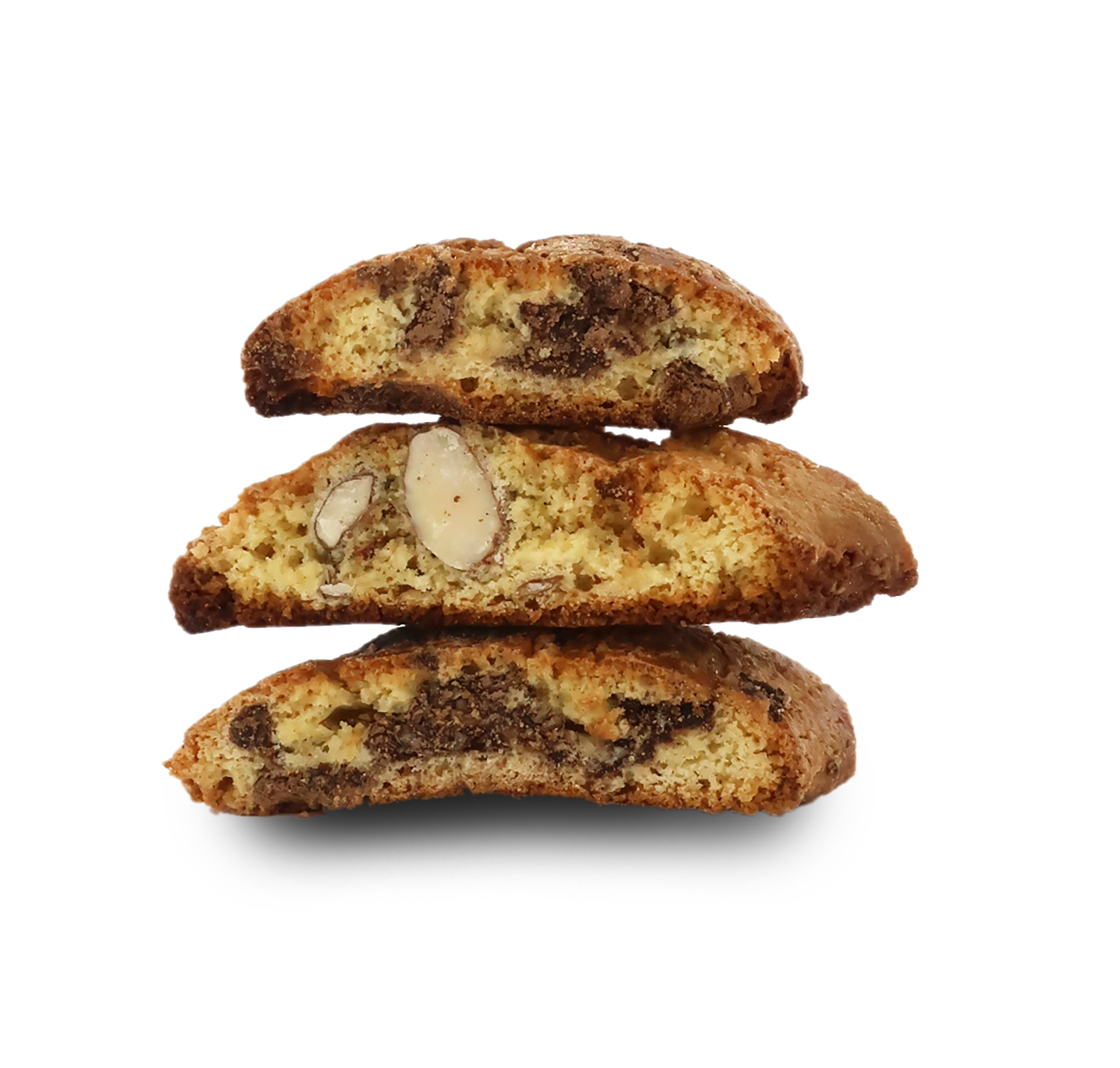 Ingredienti biscotti al cioccolato: farina di GRANO tenero, zucchero, cioccolato fondente 20% (cacao, zucchero, burro di cacao, bacche di vaniglia Bourbon), UOVA di galline allevate all' aperto. Può contenere MANDORLE, PISTACCHI, SOIA, PINOLI, BURRO e NOCCIOLE. Allergeni in maiuscolo.