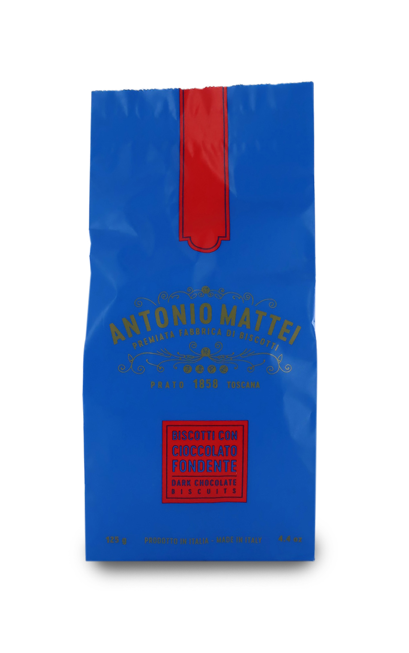 Mattei rivisita il cantuccio in questa versione sfiziosa, sostituendo le classiche mandorle con gocce di cioccolato fondente. Per la sua preparazione, viene impiegato un cioccolato fondente di qualità, che rende questi cantucci ancora più sfiziosi e golosi.